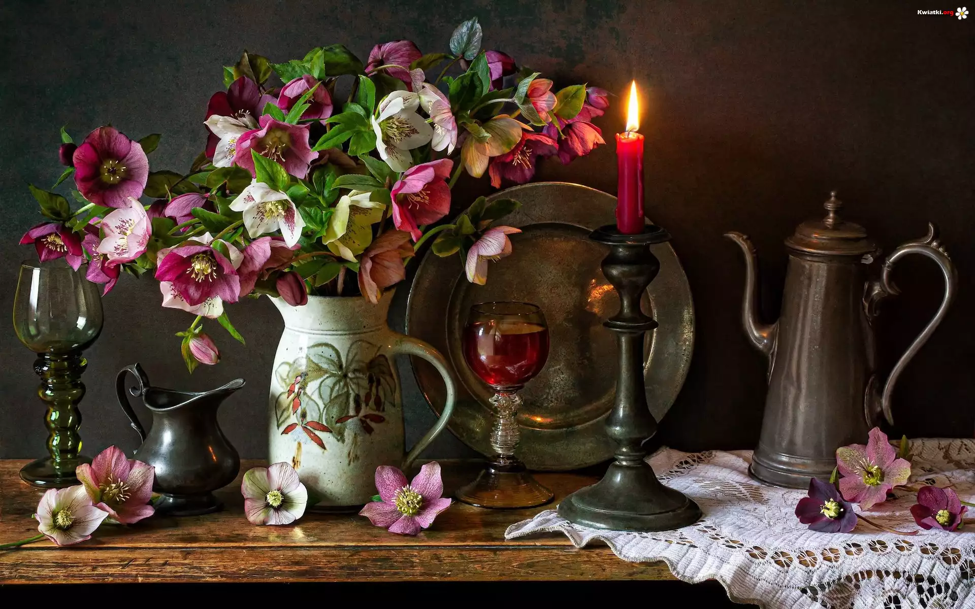 Kompozycja, Kwiaty, Ciemierniki, Dzbanek, Świeca, Kieliszek, Serwetka - Zdjęcia