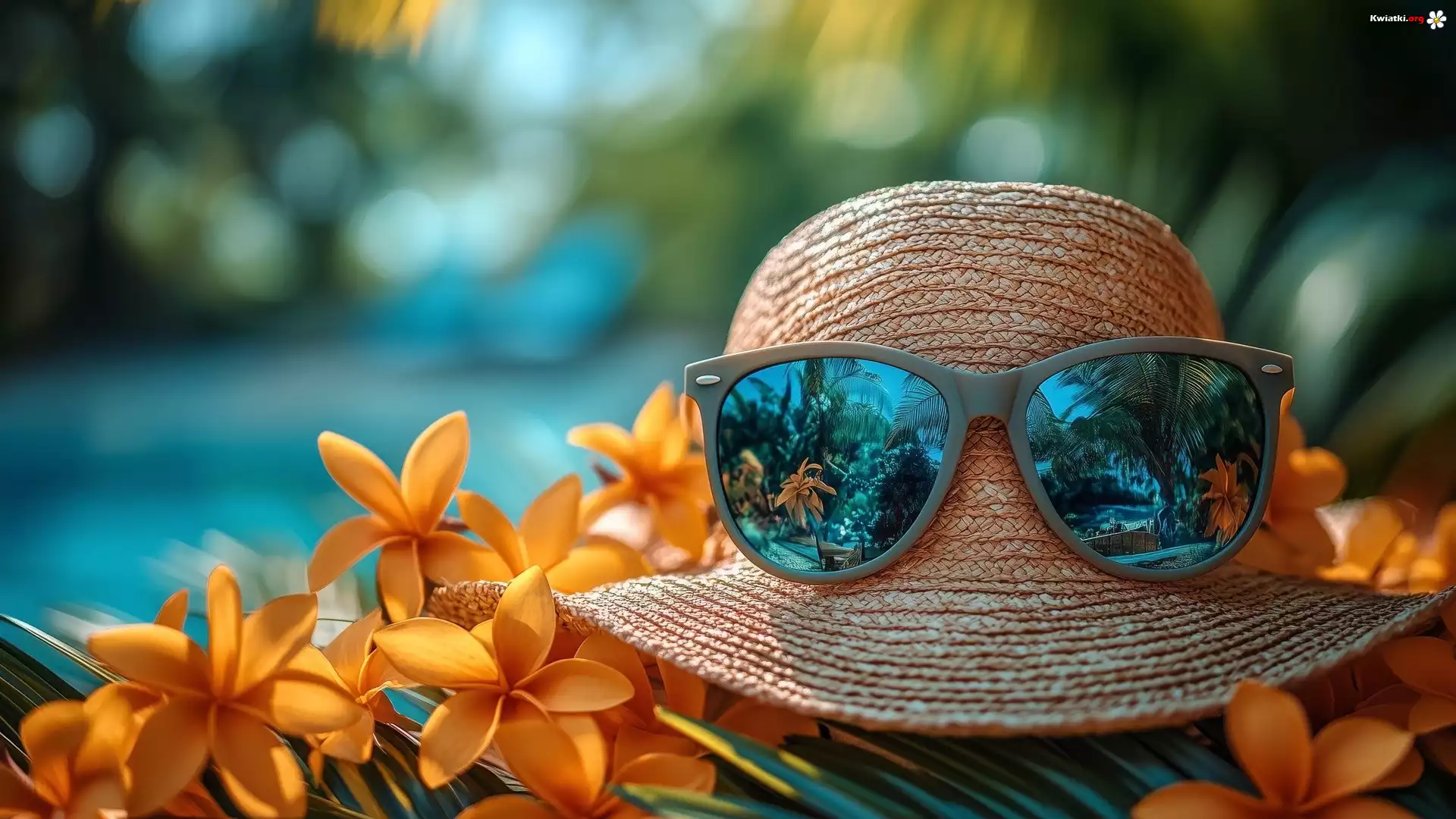 Kapelusz, Okulary, Żółte, Kwiaty, Plumerie, Kompozycja - Zdjęcia