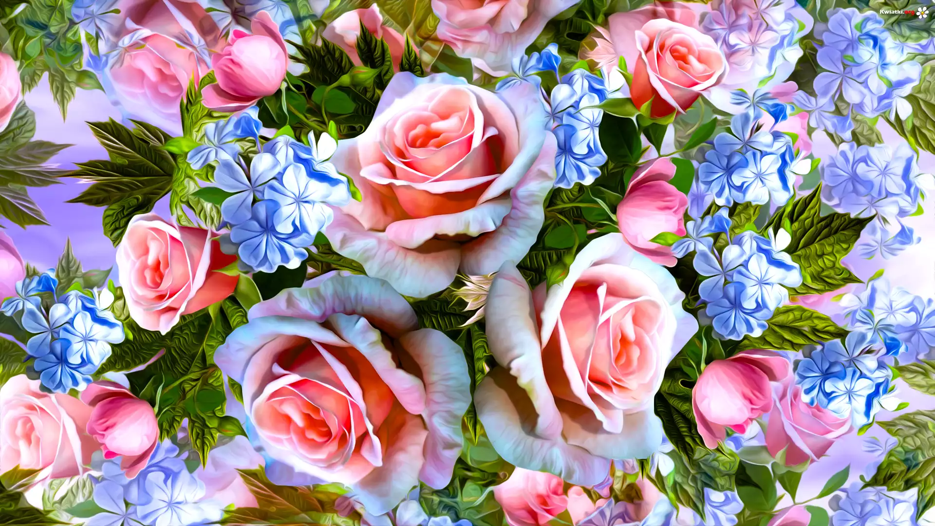 Kwiaty, Różowe, Róże, Niebieskie, Kwiatki, Grafika - Zdjęcia