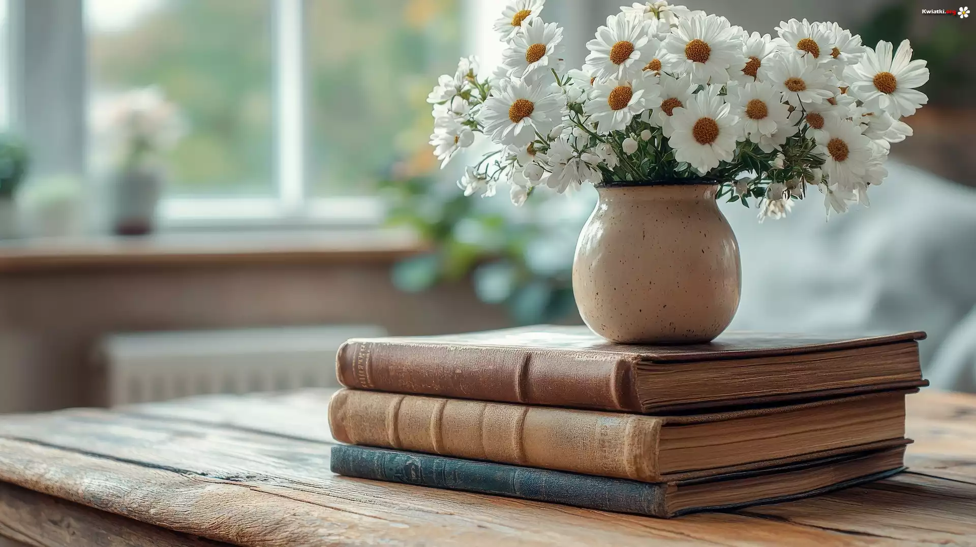 Książki, Kwiaty, Margerytki, Wazon, AI - Zdjęcia
