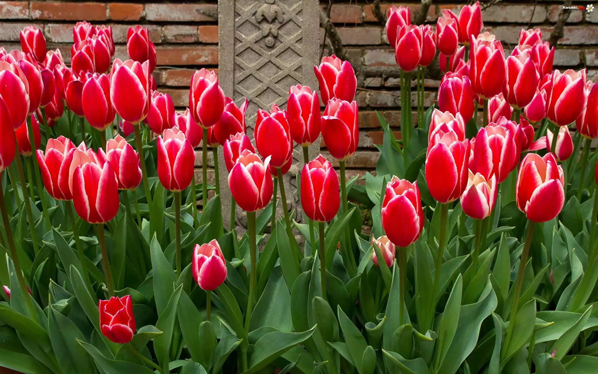 Kwiat Kwiaty, Tulipany, Liście, Murek, Cegły