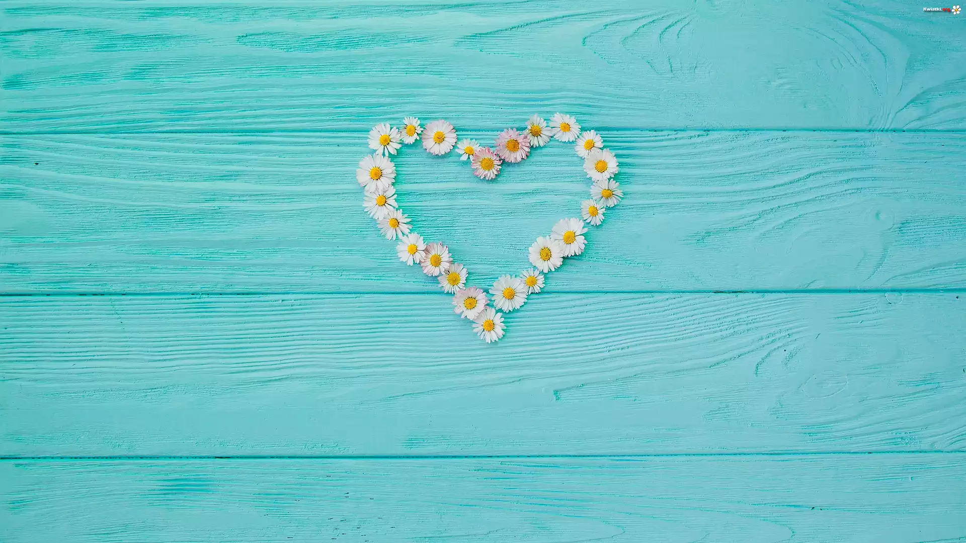 Kwiaty, Stokrotki, Serce, Niebieskie, Deski - Zdjęcia