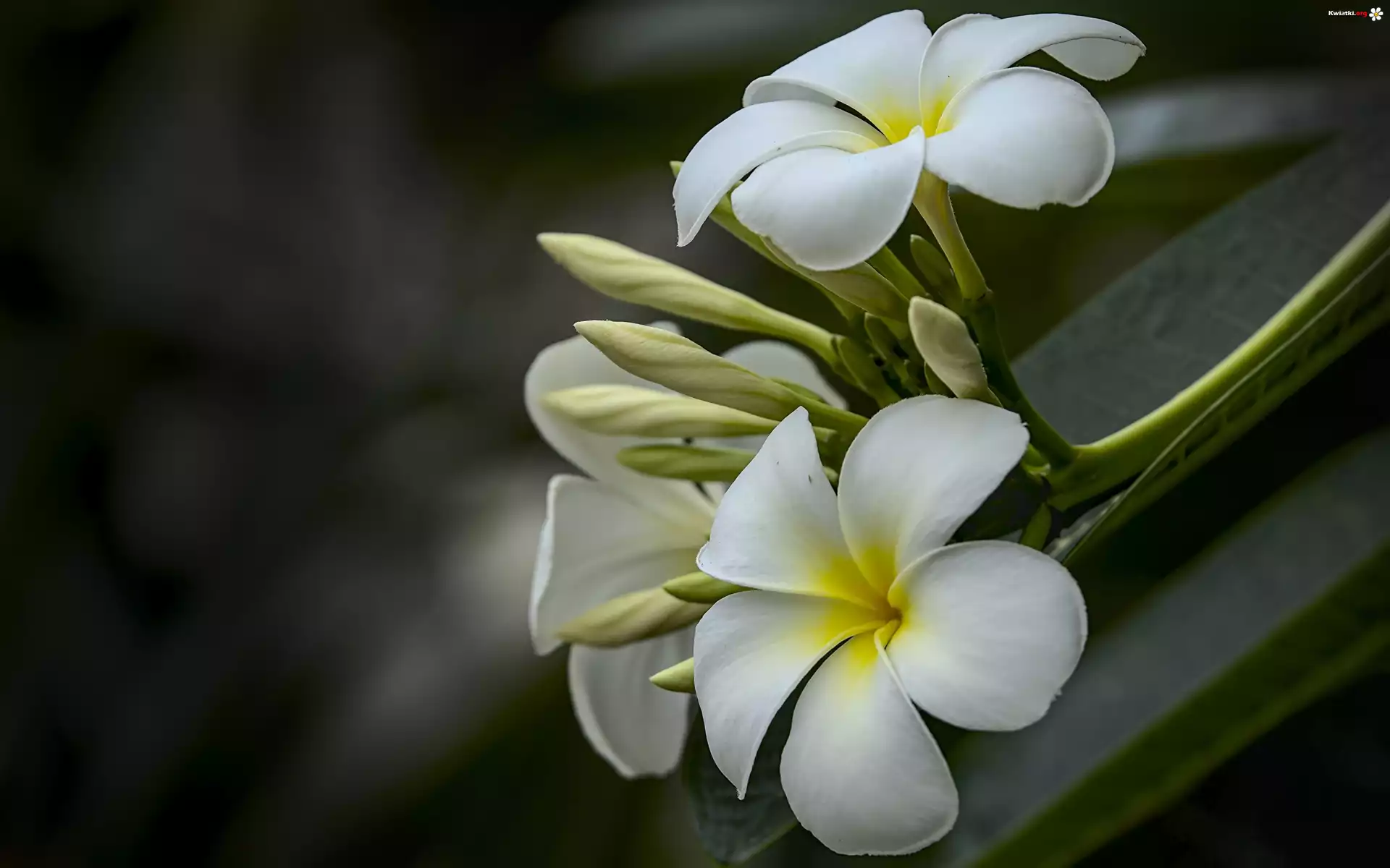 Kwiat Kwiaty, Plumeria, Pąki, Łodyga, Liście