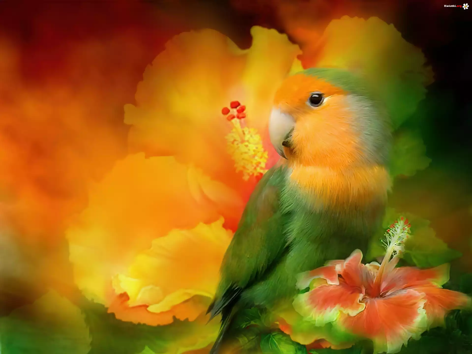 Papuga, Kwiaty, Hibiskus - Zdjęcia