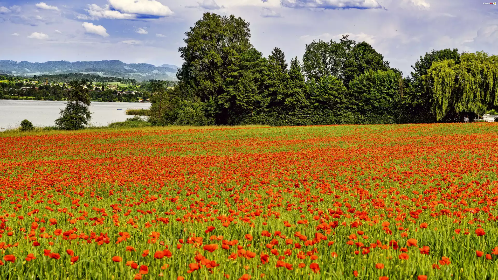 Maki, Kwiaty, Pole, Drzewa, Krajobraz - Zdjęcia