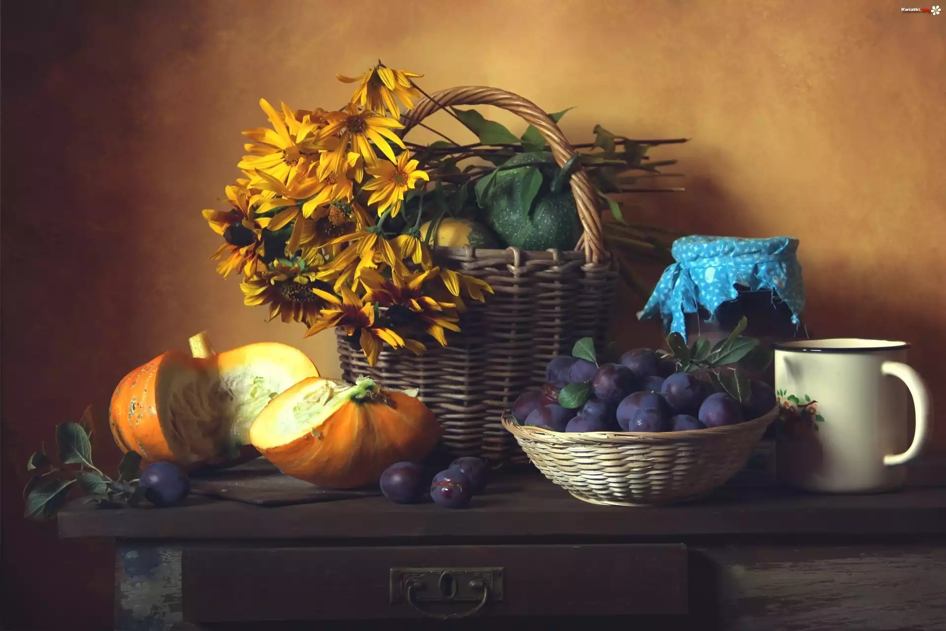 Kwiat Kwiaty, Bukiet, Sloneczniki, Sliwki, Dynia
