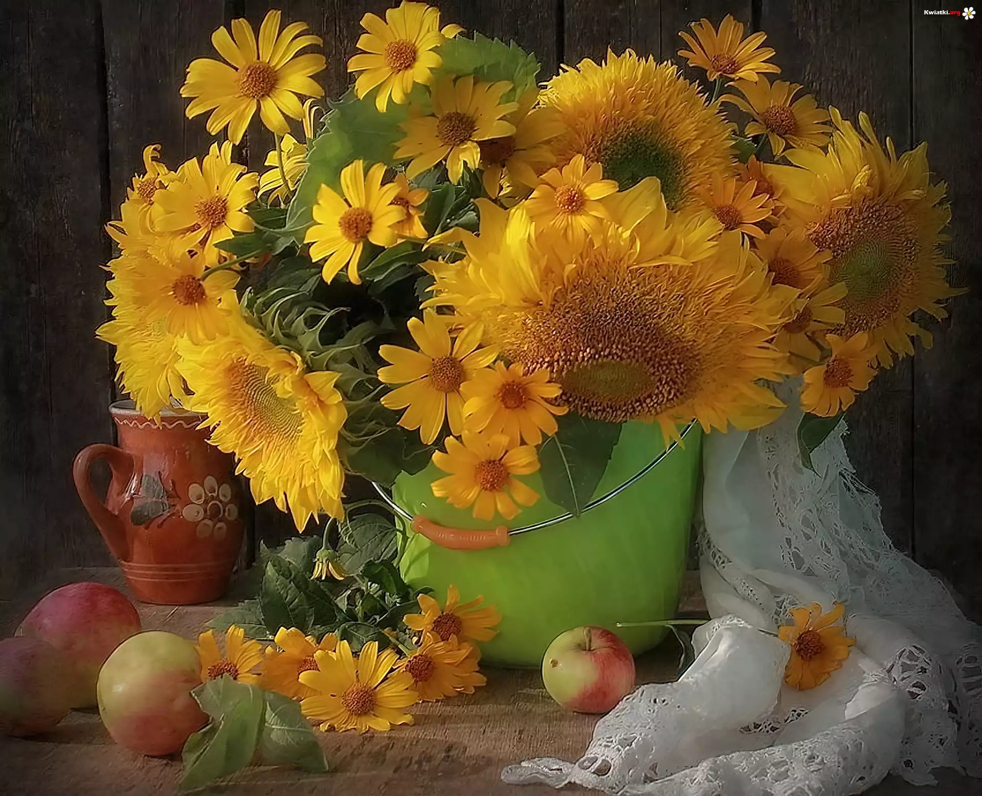 Kwiaty, Słonecznik, Słoneczniczek Szorstki, Jabłka - Zdjęcia