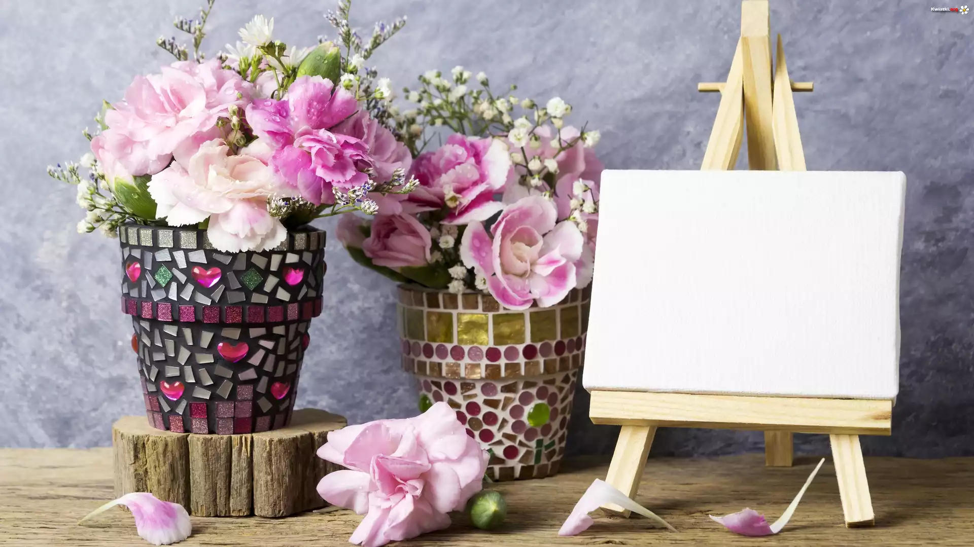 Kwiat Kwiaty, Goździki Szabo, Doniczki, Tablica, Kompozycja