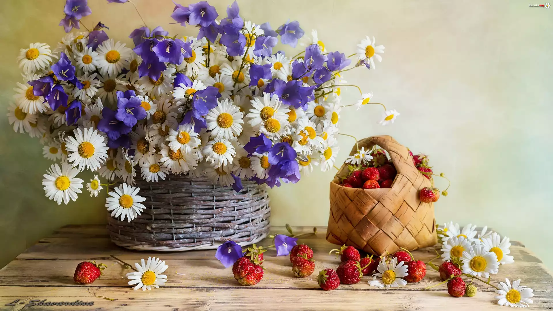 Kwiaty, Rumianki, Dzwonki, Truskawki, Koszyczki - Zdjęcia