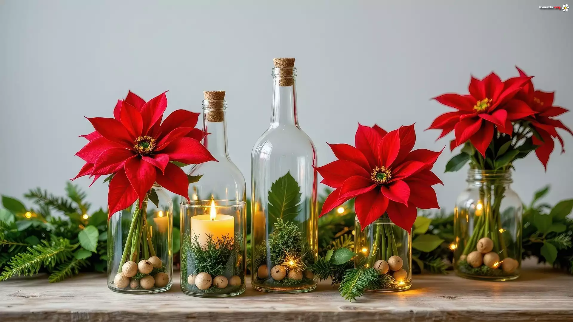 Kwiaty, Gwiazda betlejemska, Butelki, Słoiki, Świeca, Zielone, Rośliny, Kompozycja - Zdjęcia
