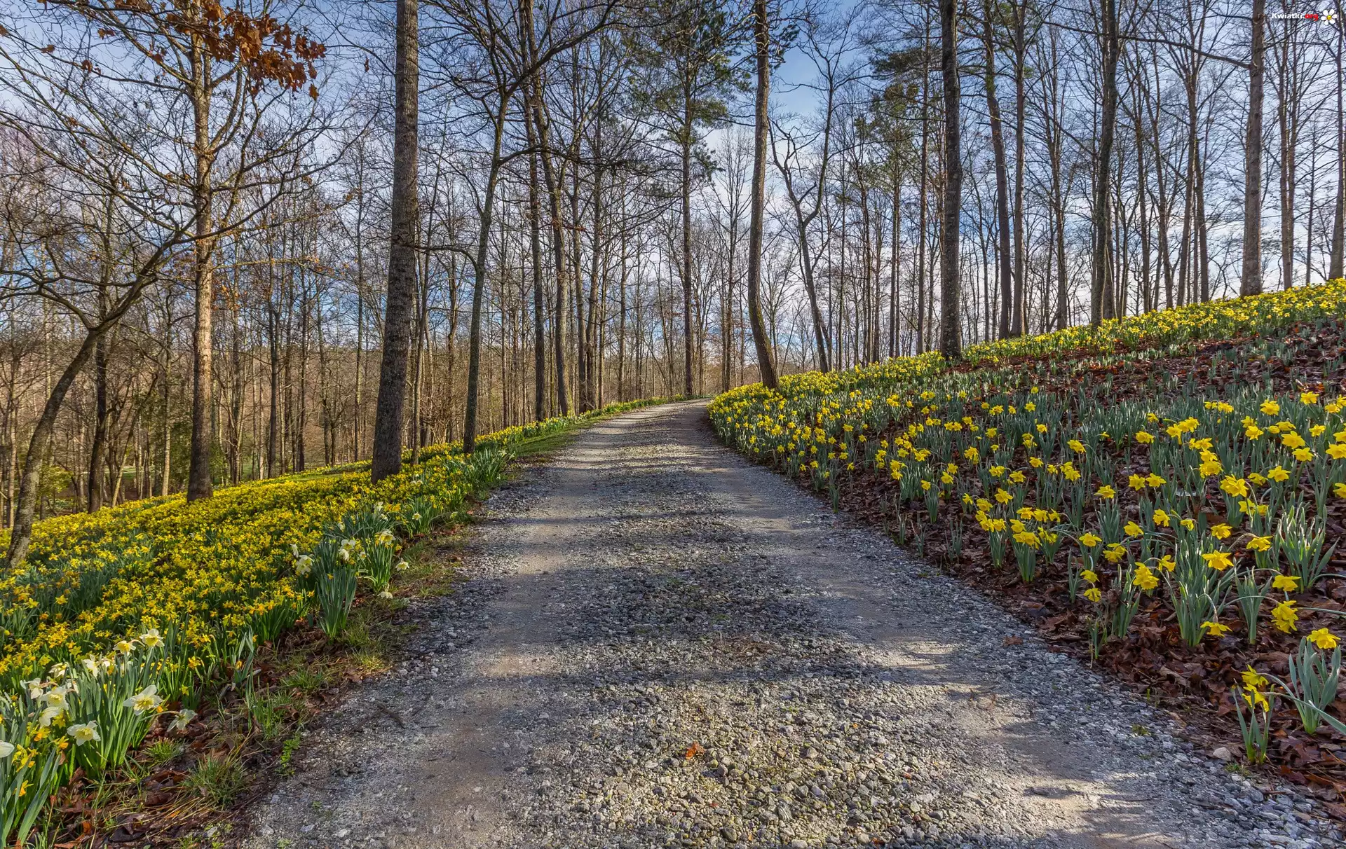 Droga, Kwiaty, Żonkile, Drzewa, Wiosna - Zdjęcia