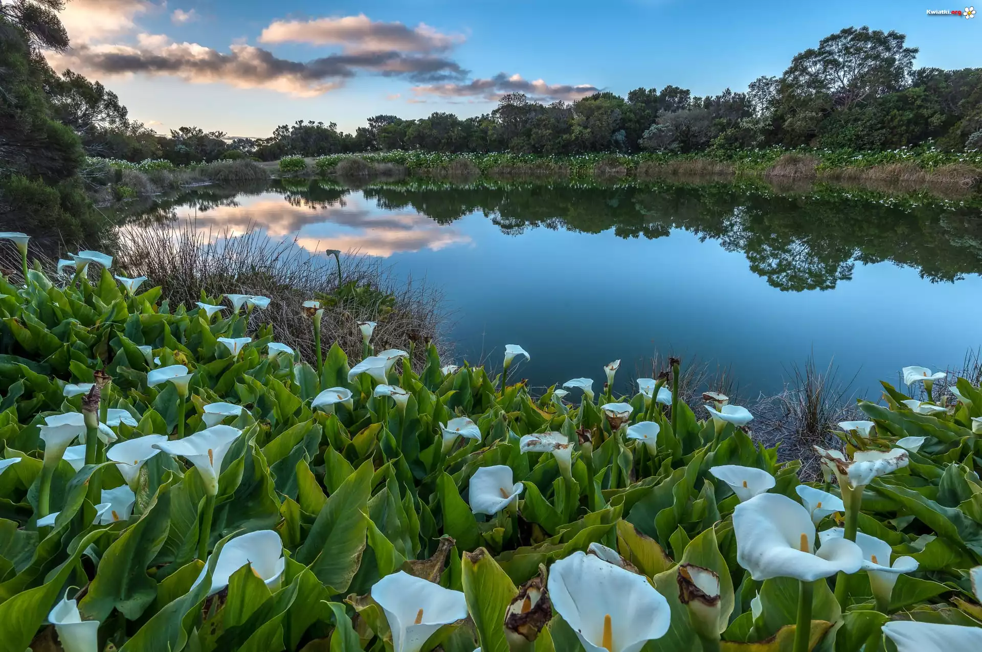 Kwiat Francja, Wyspa Reunion, Piton de l Eau, Jezioro, Białe, Kwiaty, Kalie, Drzewa