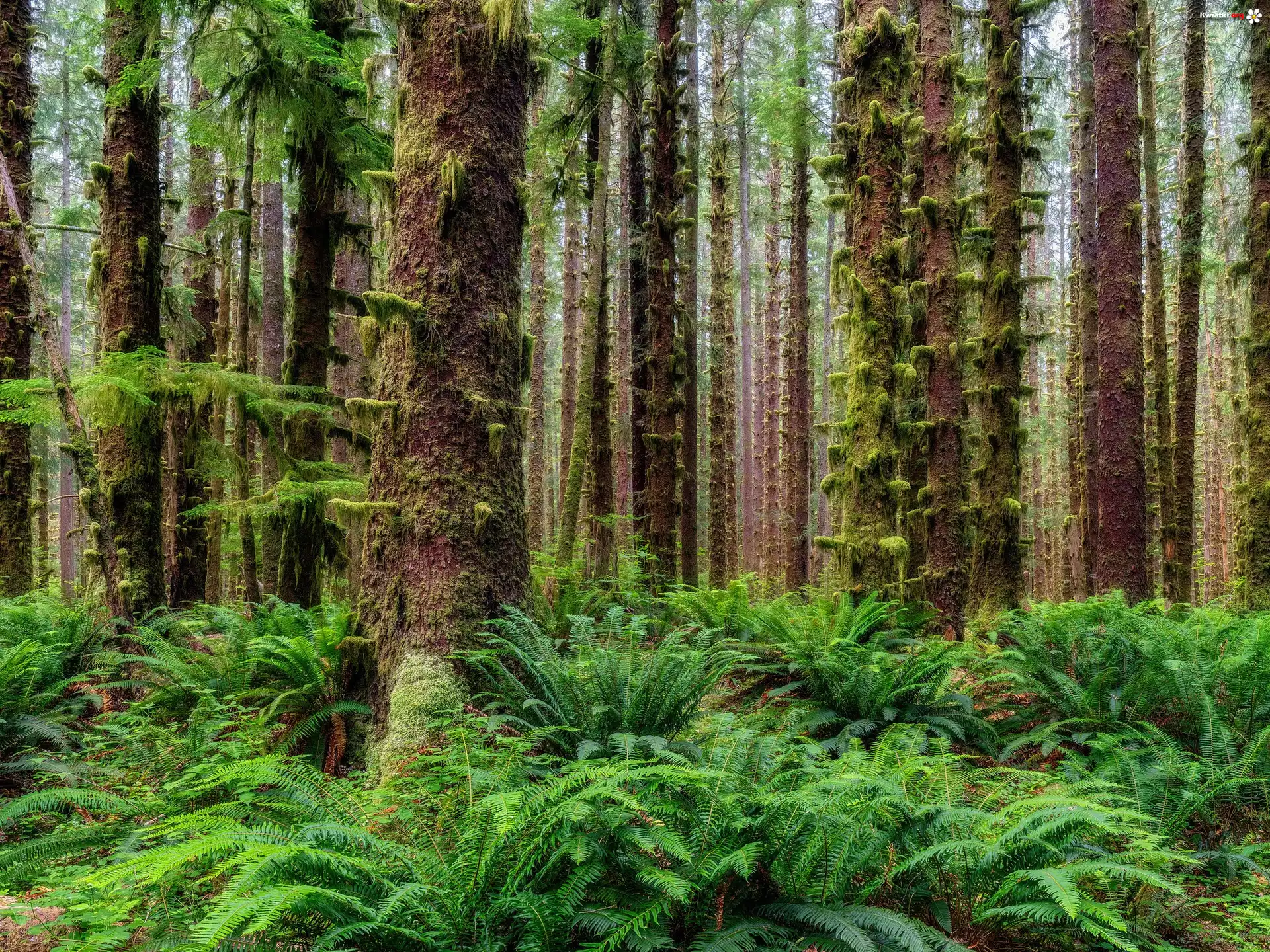 Stany Zjednoczone, Waszyngton, Park Narodowy Olympic, Las, Drzewa, Omszone, Pnie, Paprocie - Zdjęcia |