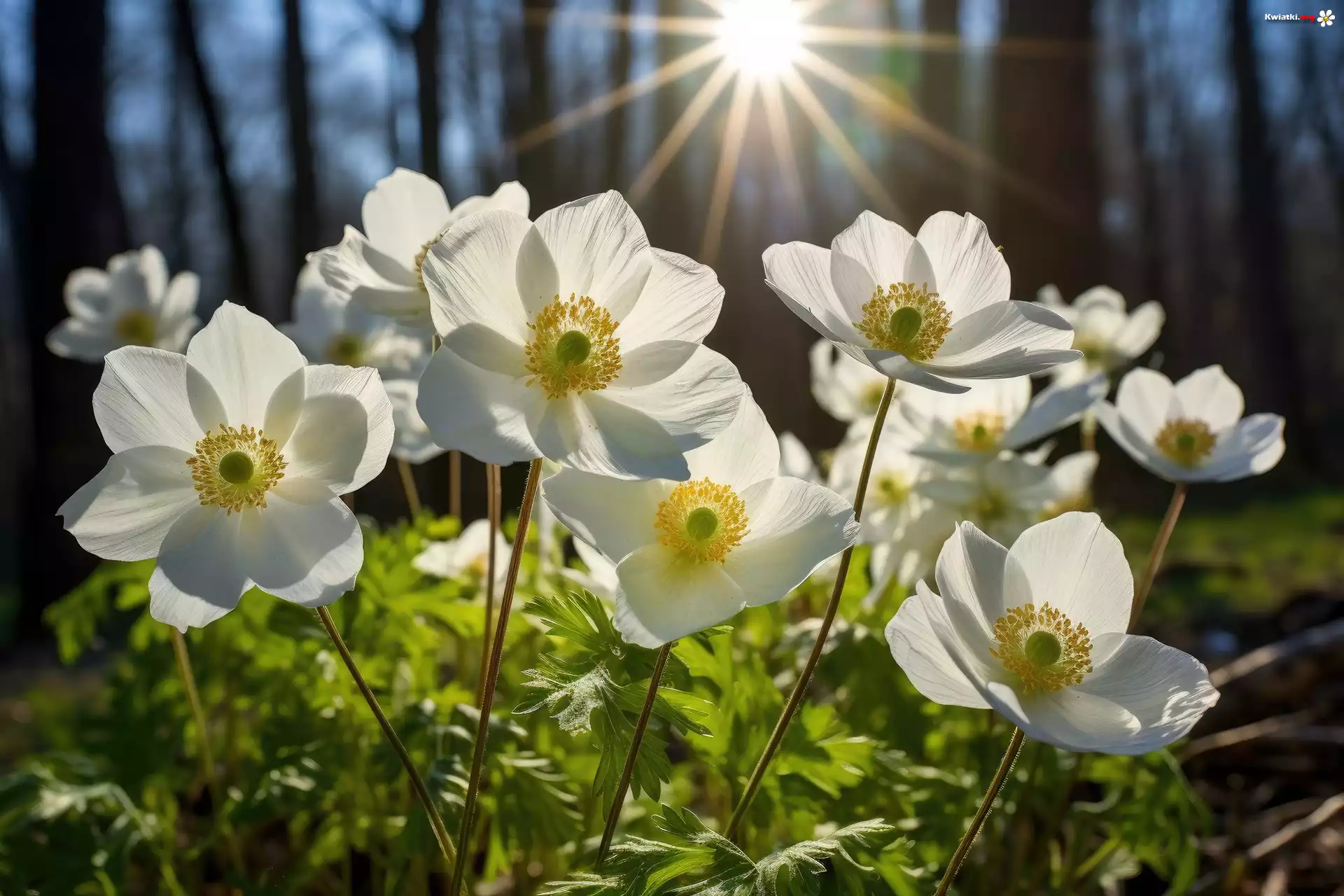 Zawilce, Białe, Kwiaty, Las, Promienie słońca, Grafika - Zdjęcia
