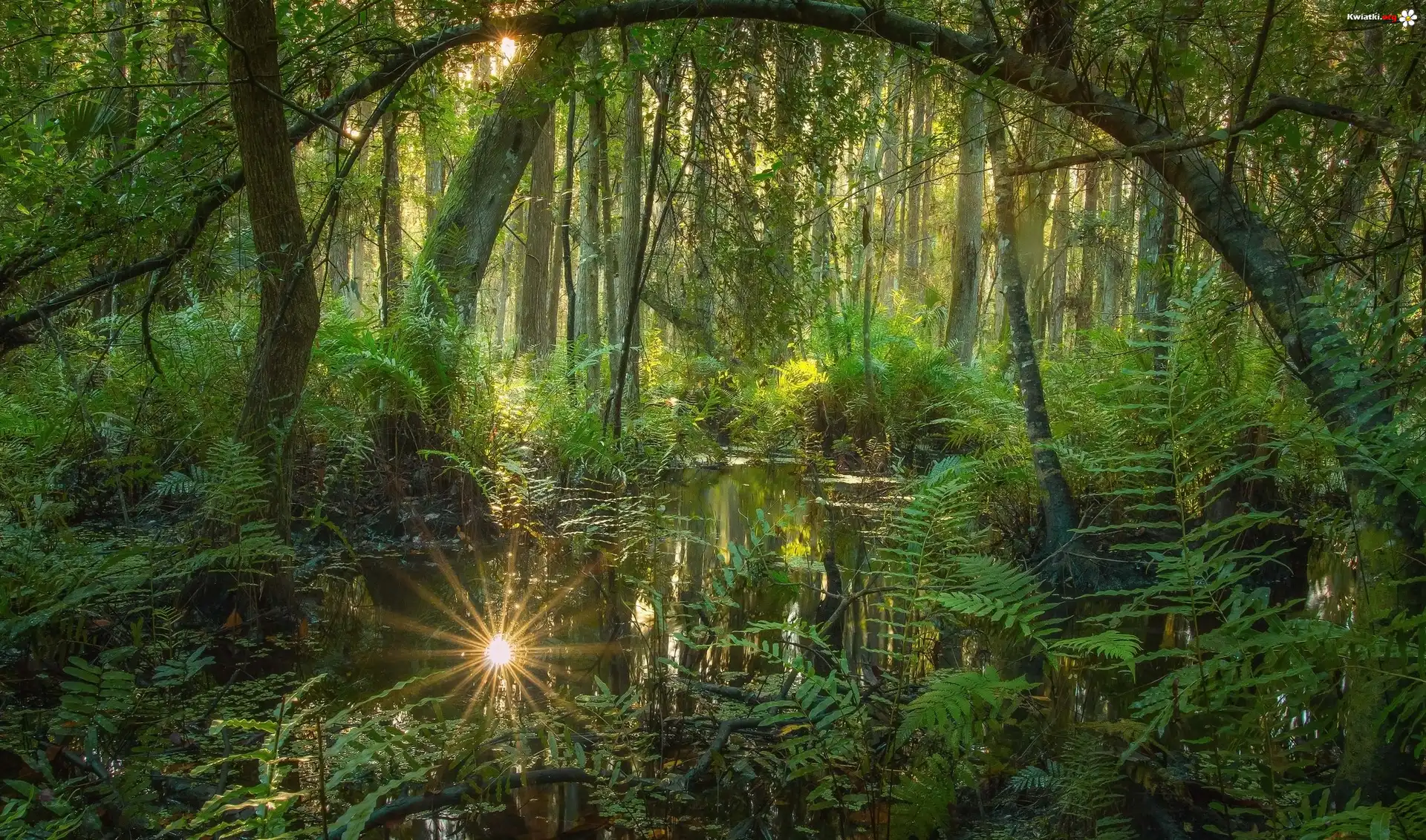 Kwiat Las, Rzeczka, Paprocie, Promienie, Słońca
