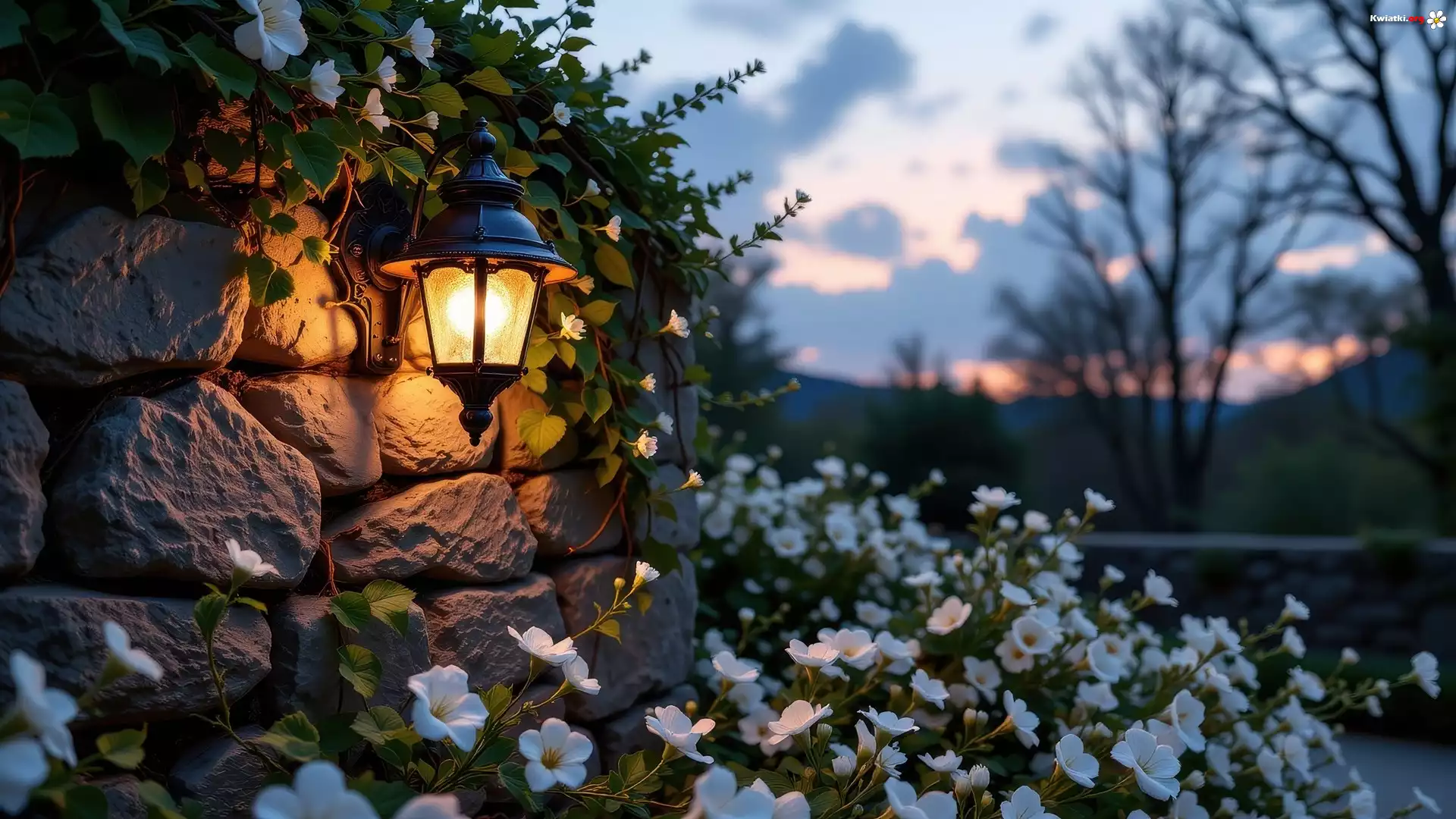 Mur, Latarnia, Białe, Kwiaty, Drzewa - Zdjęcia