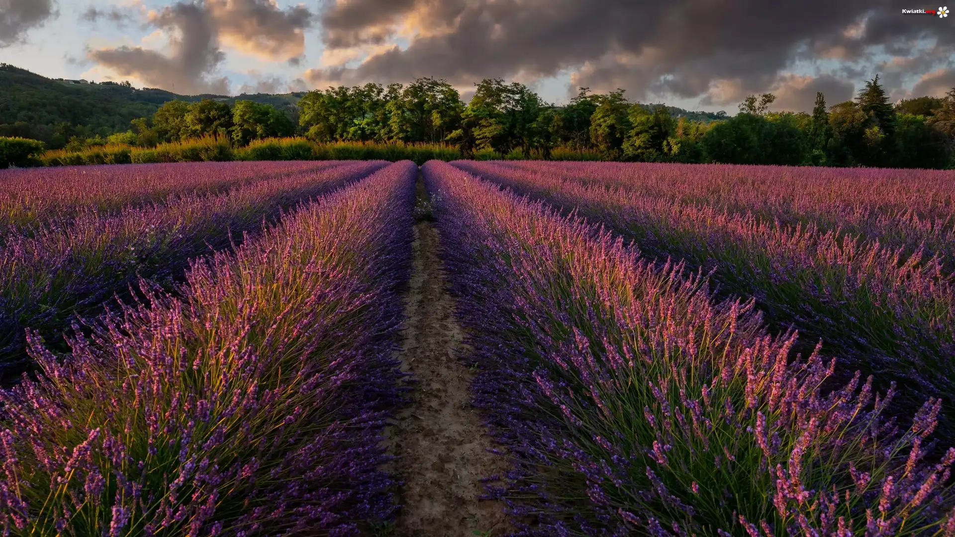 Kwiat Pole, Lawenda, Drzewa, Ciemne, Chmury
