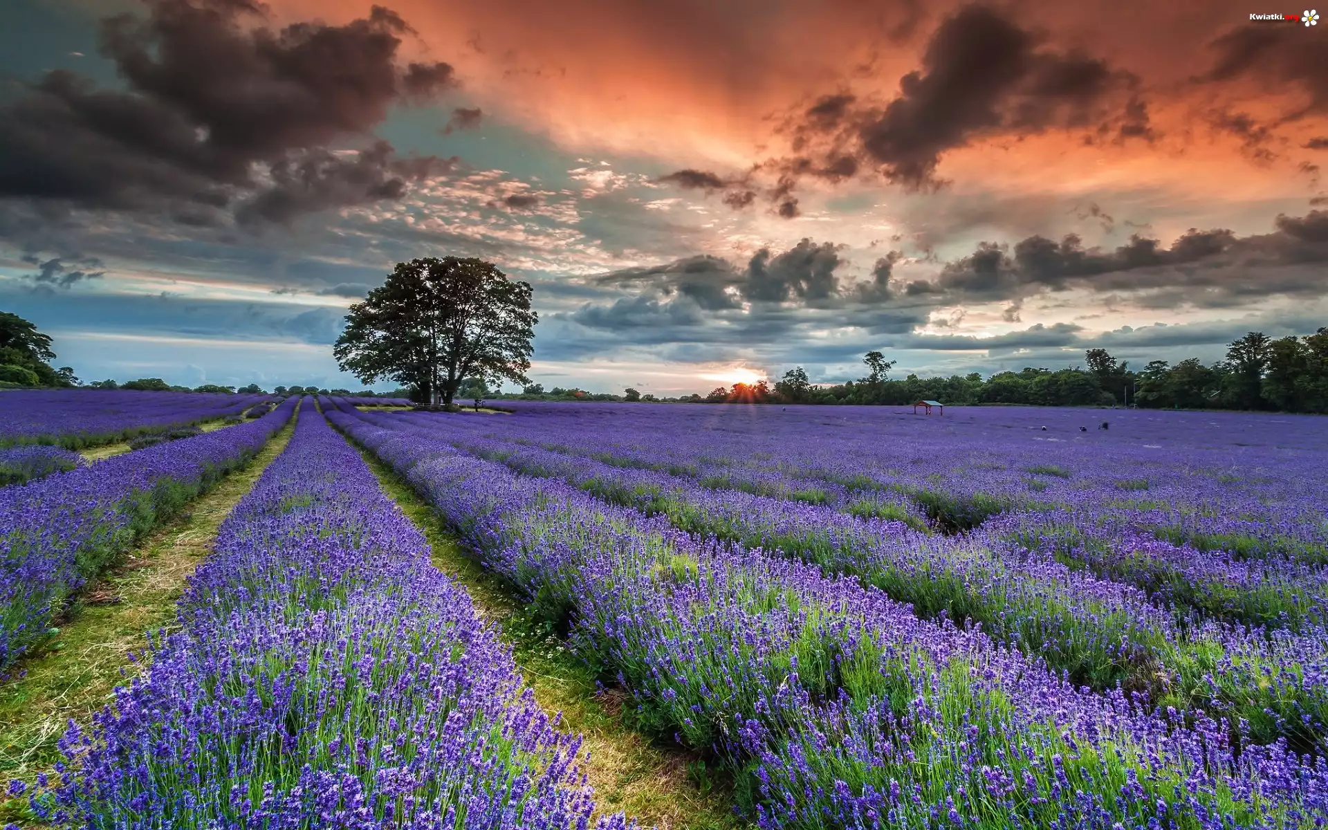 Kwiat Pole, Lawenda, Drzewo, Ciemne, Chmury, Wschód słońca