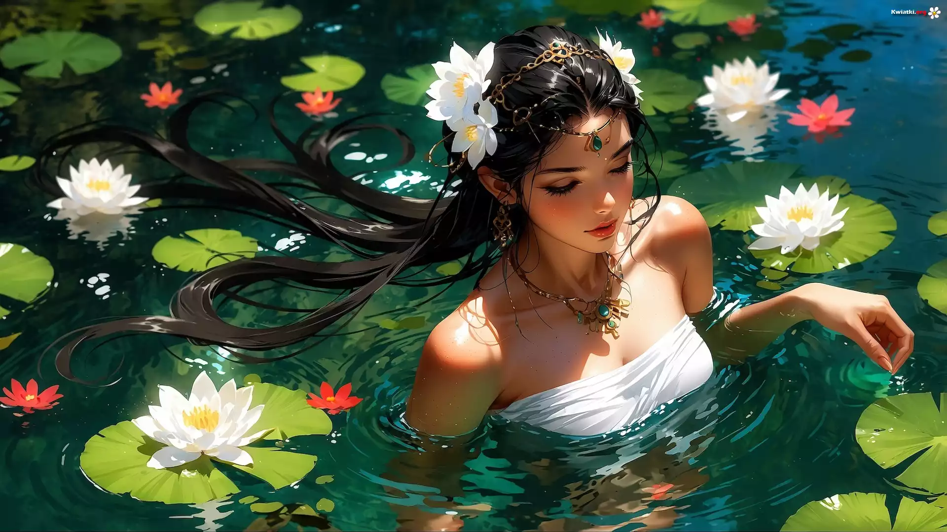 Kwiat Grafika, Kobieta, Woda, Lilie wodne, Kwiaty