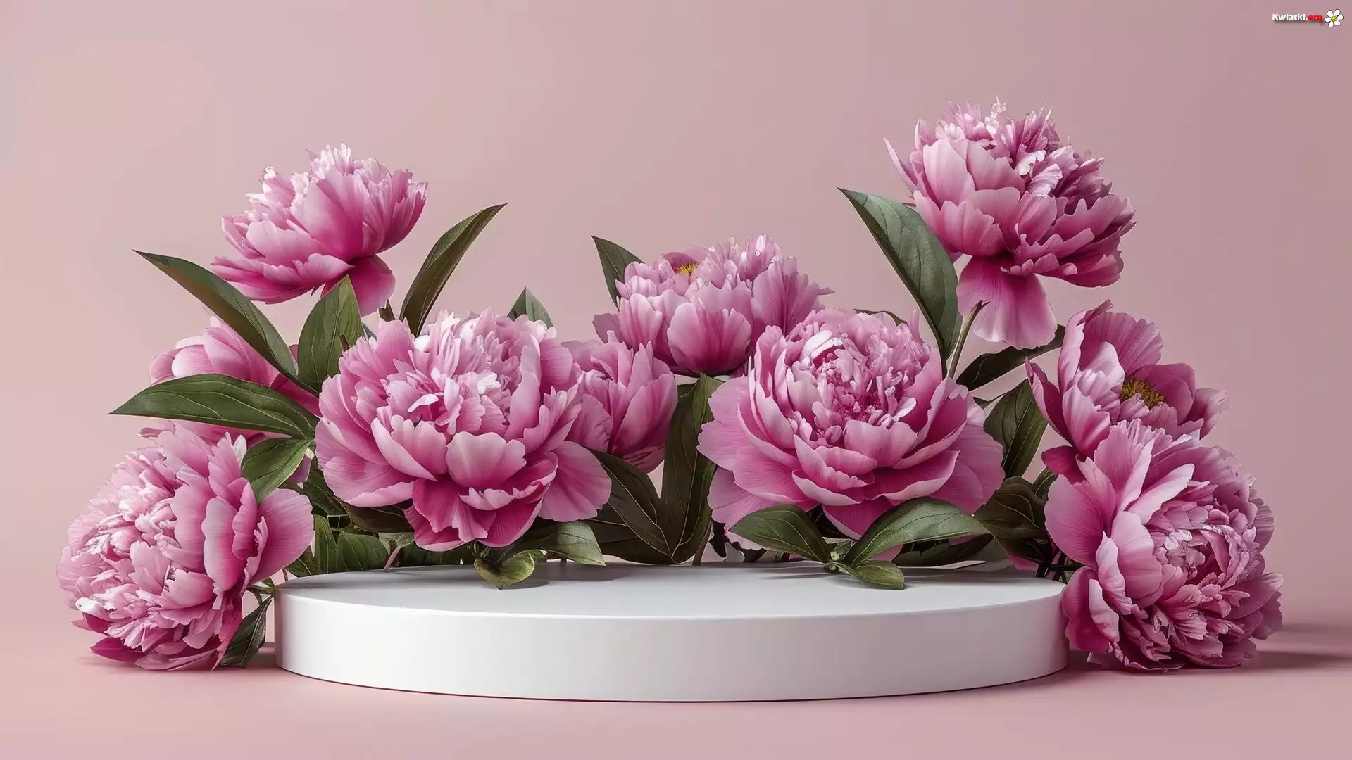 Różowe, Piwonie, Zielone, Listki, Biały, Krążek - Zdjęcia