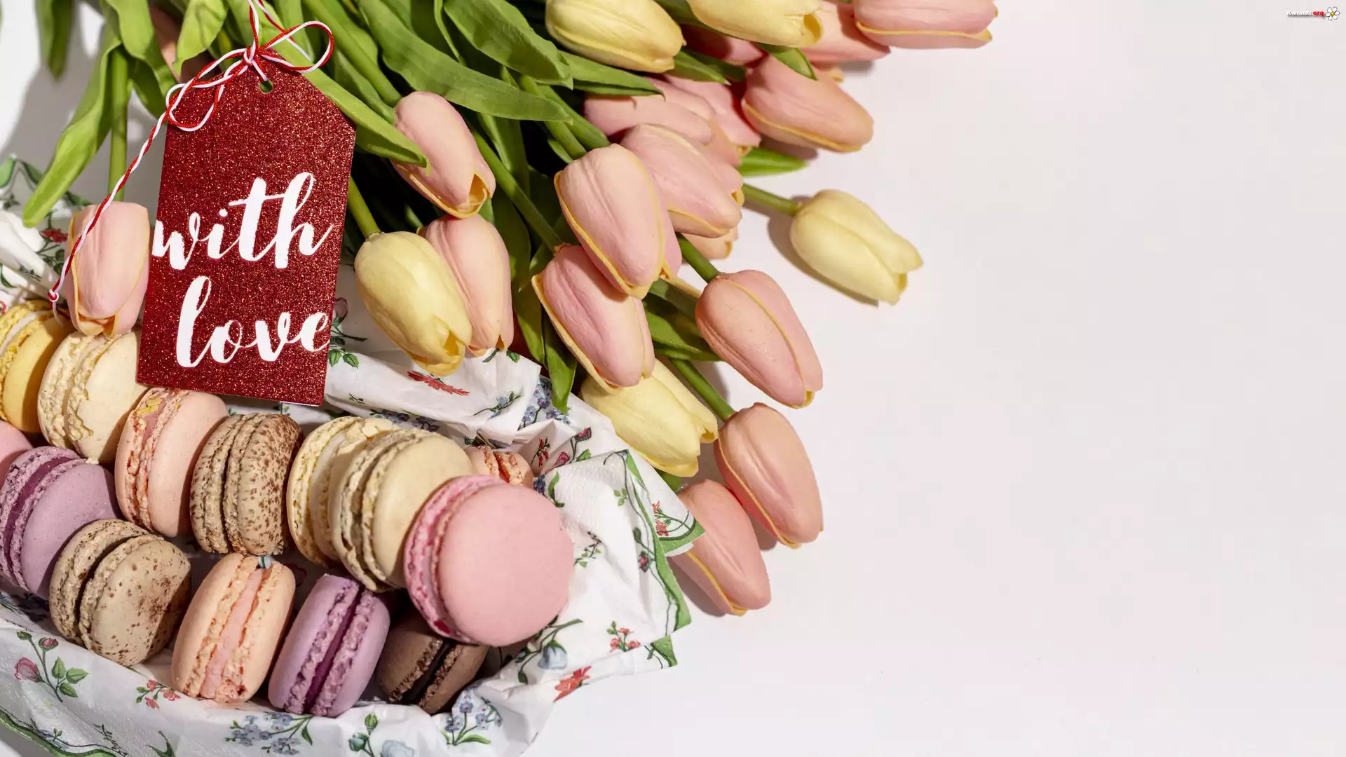 Kwiat Kwiaty, Kolorowe, Tulipany, Koszyk, Ciasteczka, Makaroniki, Zawieszka, Napis, With love