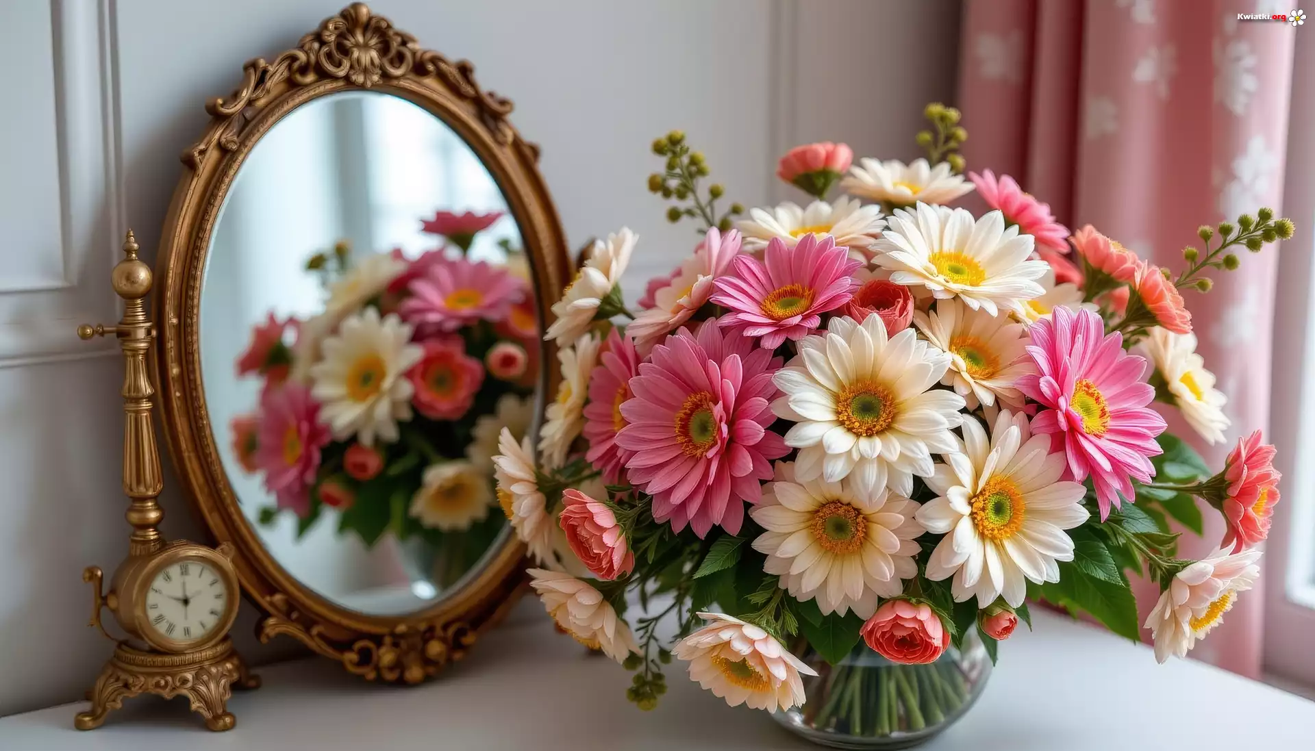 Kwiaty, Gerbery, Bukiet, Lustro, Zegar, Grafika AI - Zdjęcia