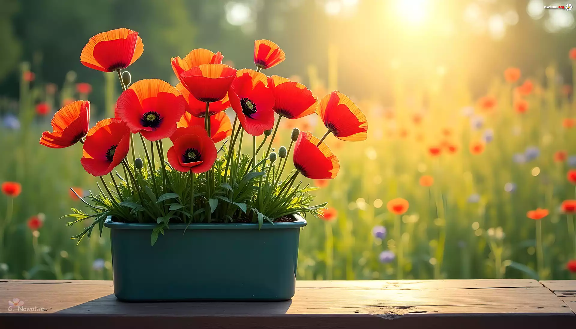 Czerwone, Maki, Kwiaty, Doniczka, Grafika - Zdjęcia