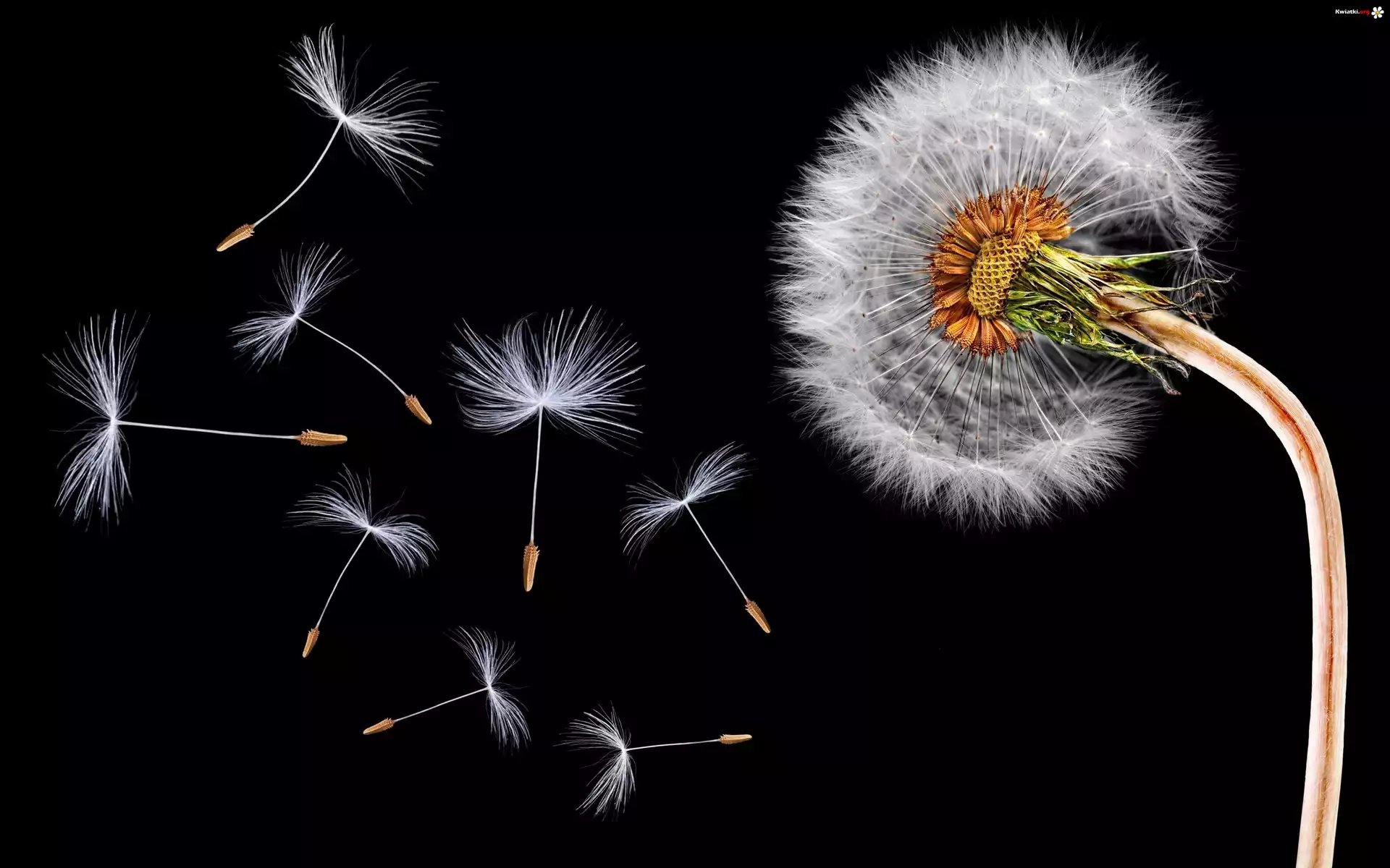 Kwiat Mniszek pospolity, Makro, Czarne tło, Dmuchawce