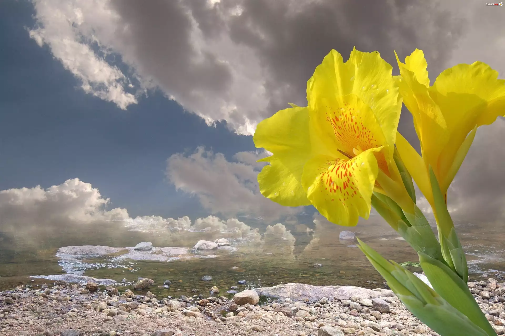 Żółty, Irys, Morze, Chmury - Zdjęcia