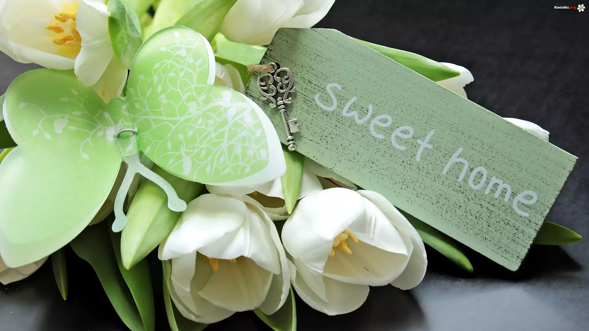 Tulipany, Motyl, Kluczyk, Plakietka, Napis, Sweet home - Zdjęcia