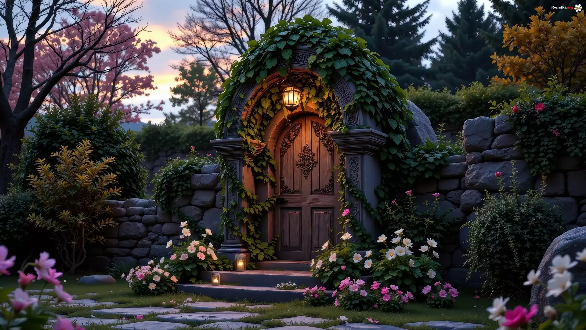 Mur, Schody, Drzwi, Latarnia, Różowe, Białe, Kwiaty, Rośliny, Drzewa - Zdjęcia