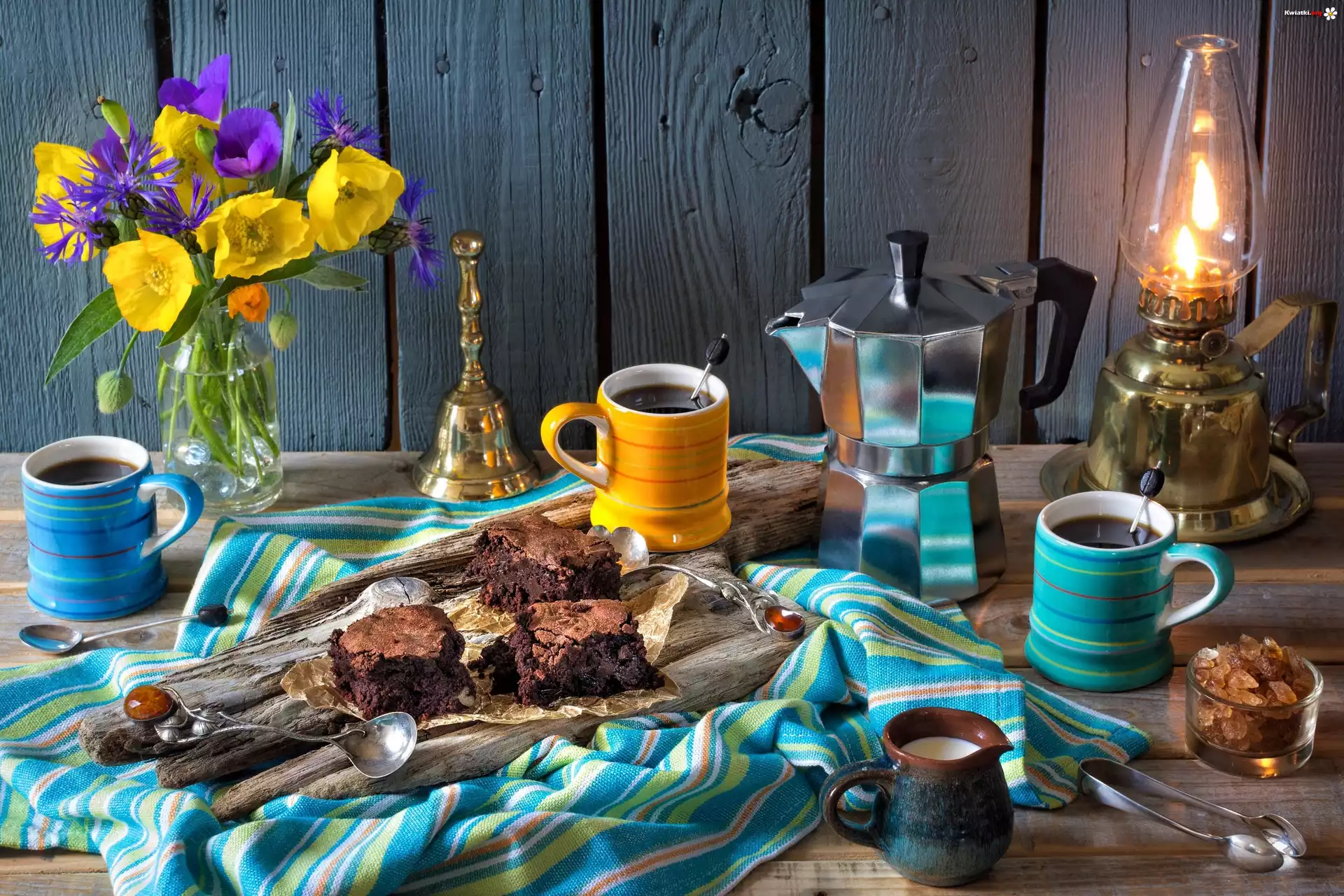 Lampa naftowa, Kawa, Kubki, Ciasto, Kwiaty, Kompozycja - Zdjęcia