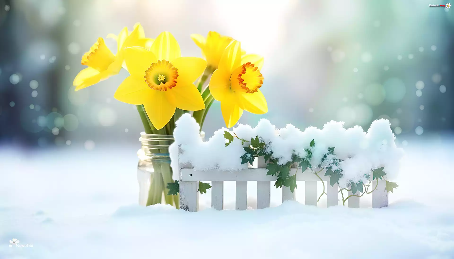 Narcyzy żonkile, Żółte, Kwiaty, Płotek, Bluszcz, Śnieg, Zima, Grafika - Zdjęcia