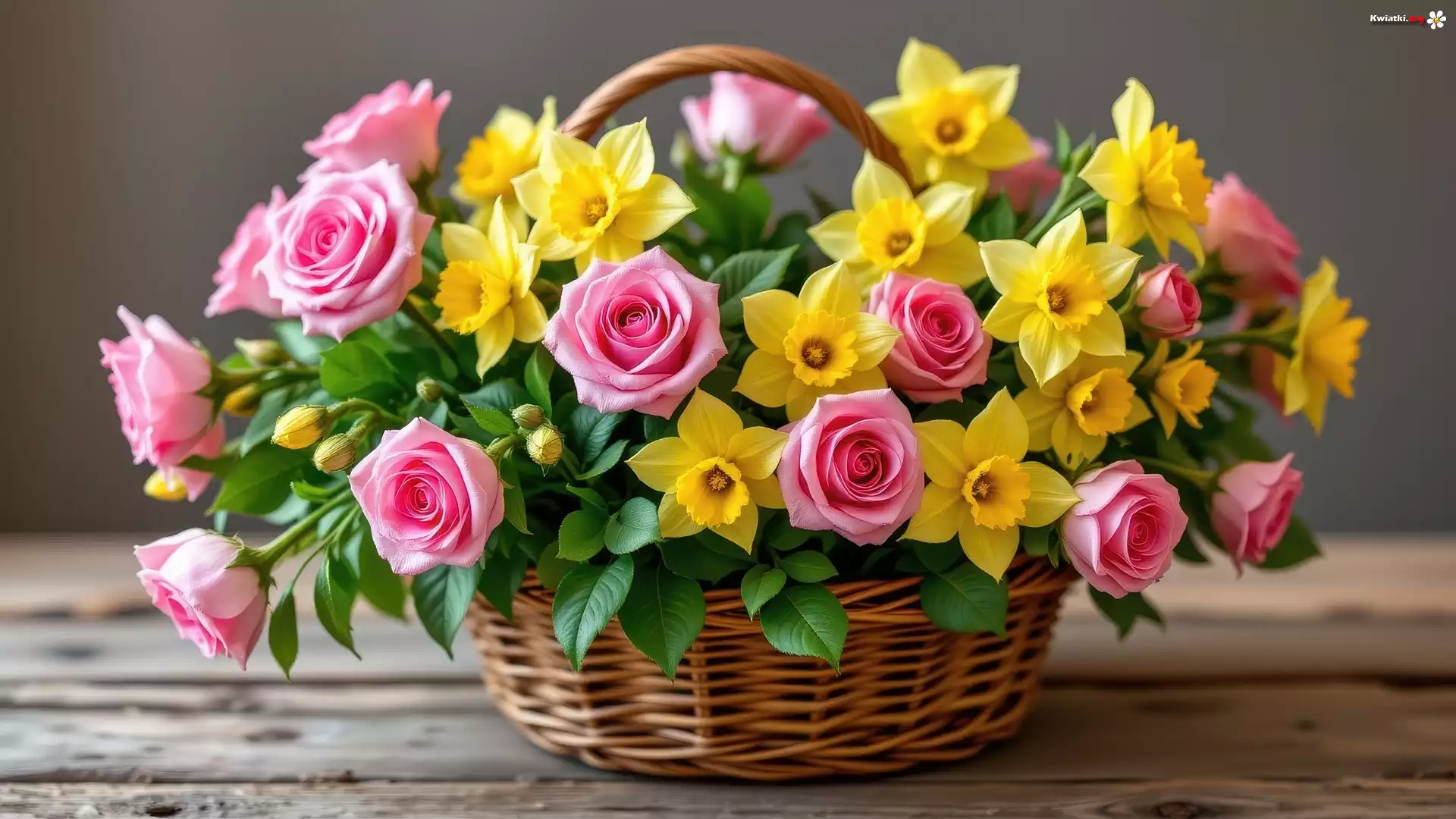Kwiat Różowe, Róże, Żółte, Narcyzy żonkile, Wiklinowy, Koszyk