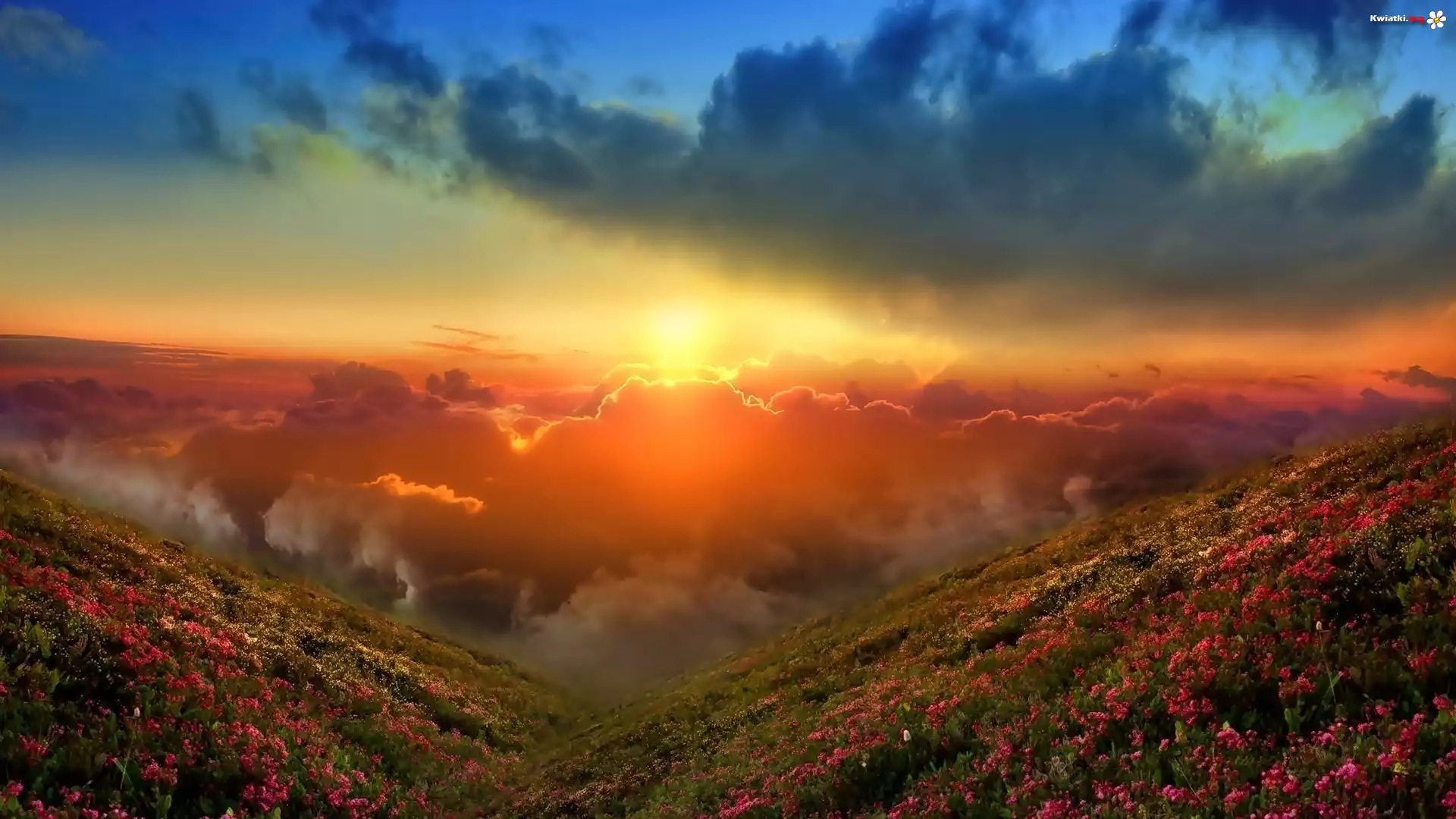 Kwiat Niebo, Zachód, Słońca, Chmury, Góry, Kwiaty