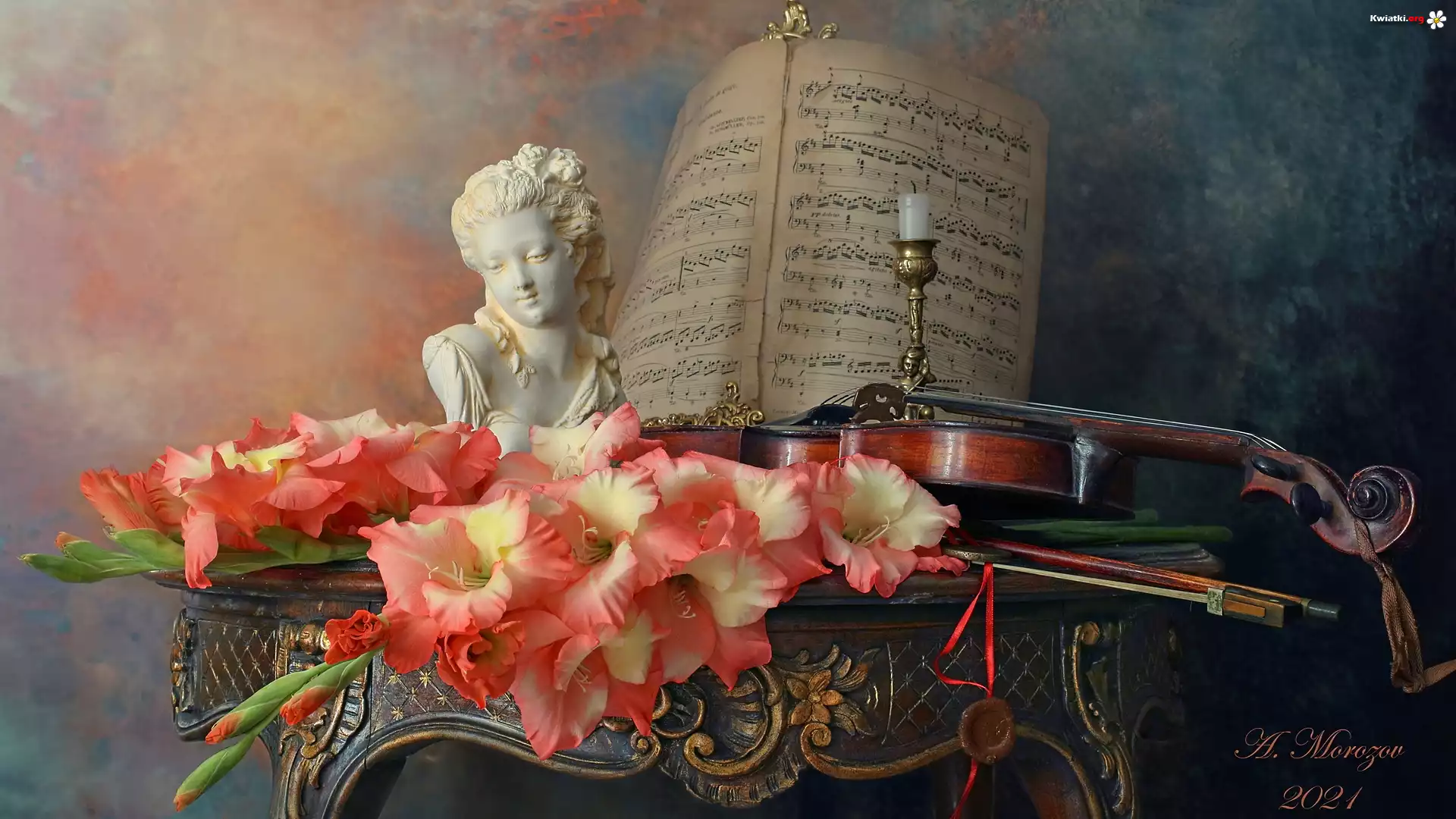 Skrzypce, Nuty, Popiersie, Kwiaty, Mieczyki, Stolik, Kompozycja - Zdjęcia