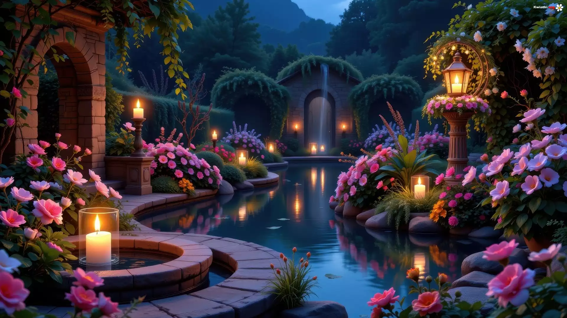 Ogród, Oczko wodne, Świece, Lampion, Różowe, Kwiaty, Rośliny, Murowany, Łuk - Zdjęcia