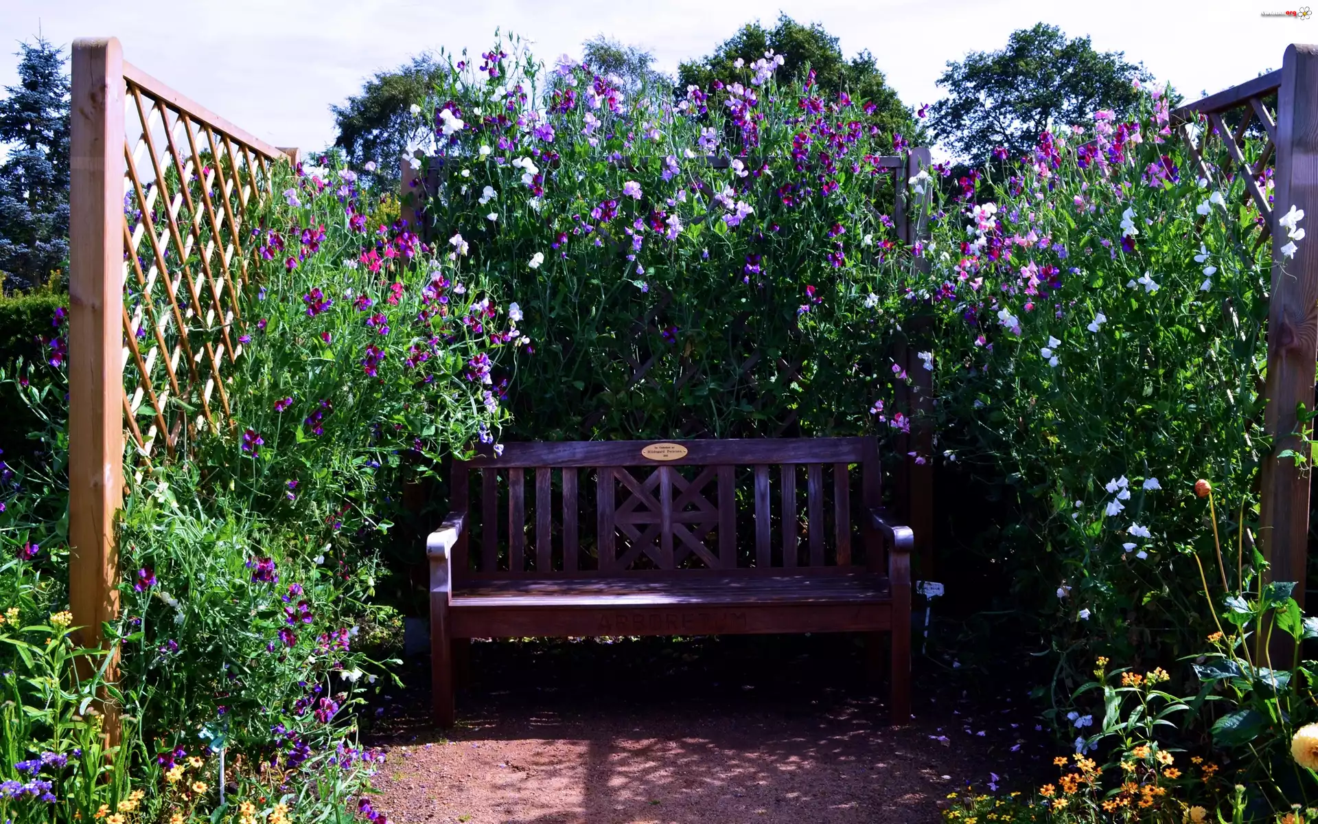 Ogród, Ławka, Pnące, Kwiatki - Zdjęcia