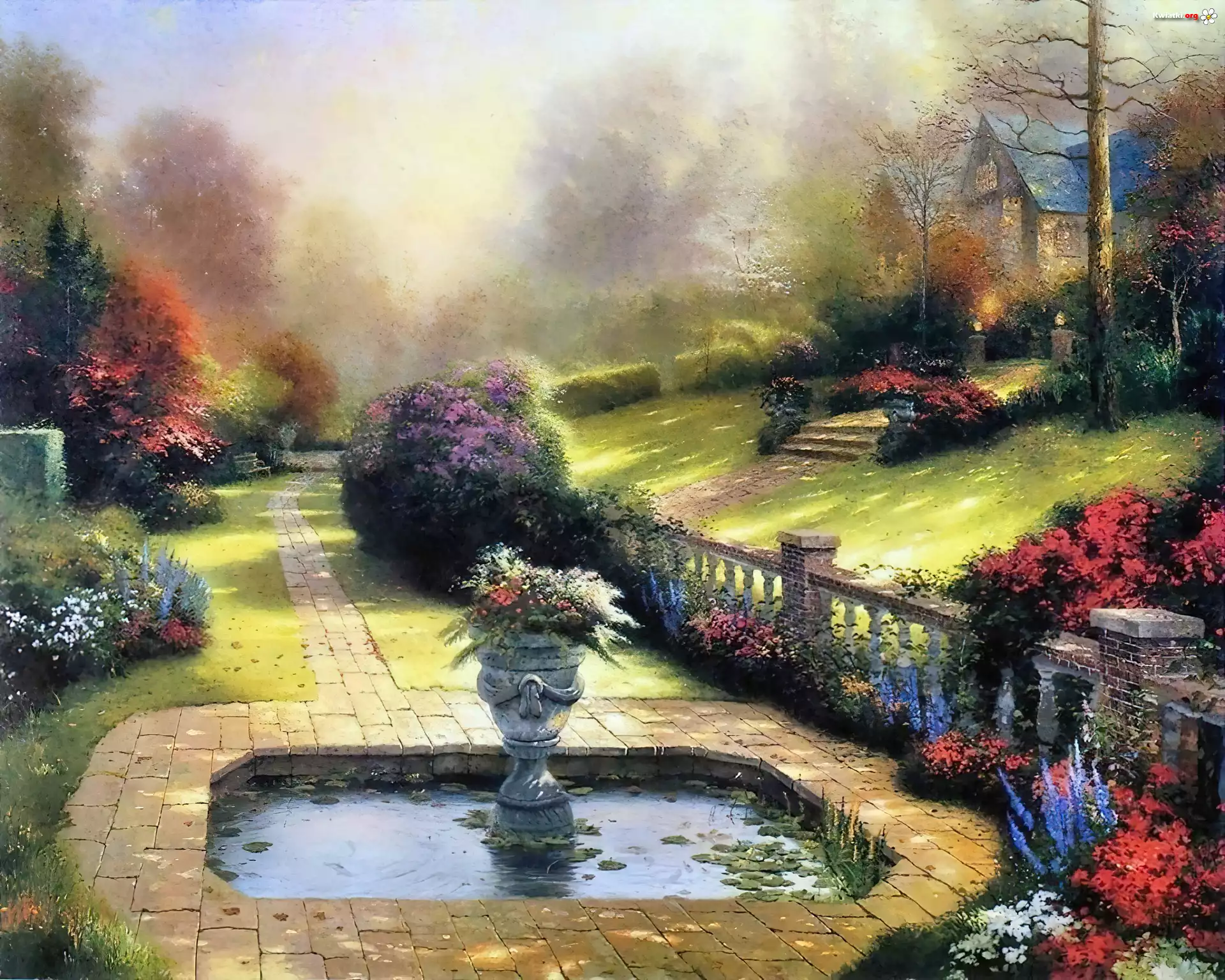 Ogród, Kwiaty, Oczko, Wodne, Thomas Kinkade - Zdjęcia