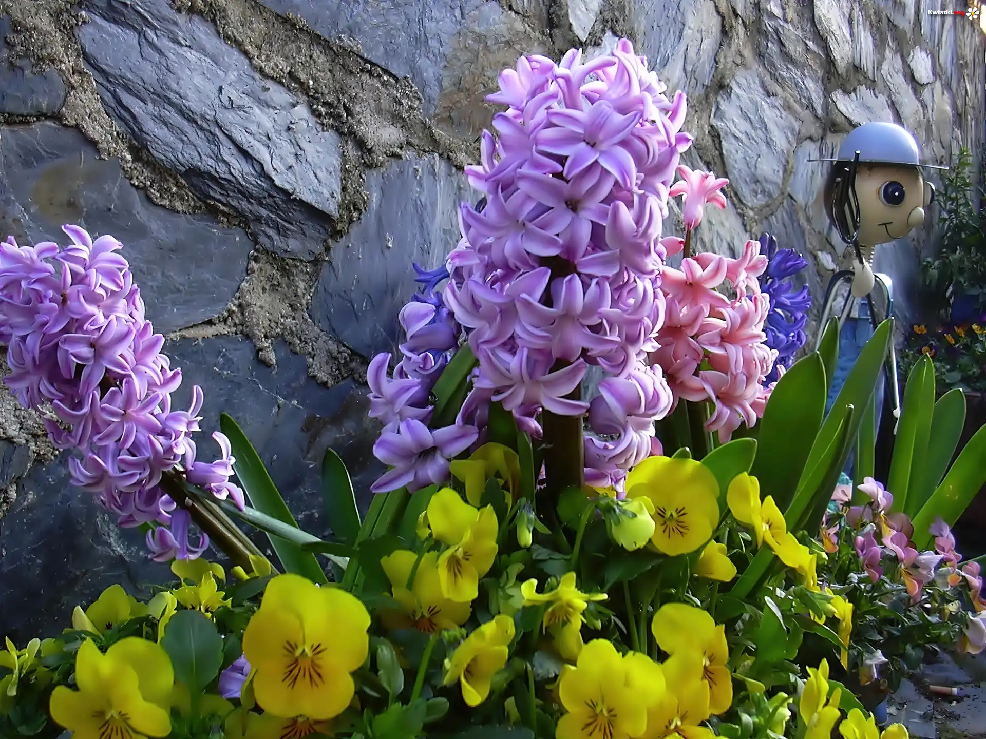 Wiosna, Ogród, Kamienie, Żółte, Bratki, Różowe, Hiacynty, Zabawka - Zdjęcia