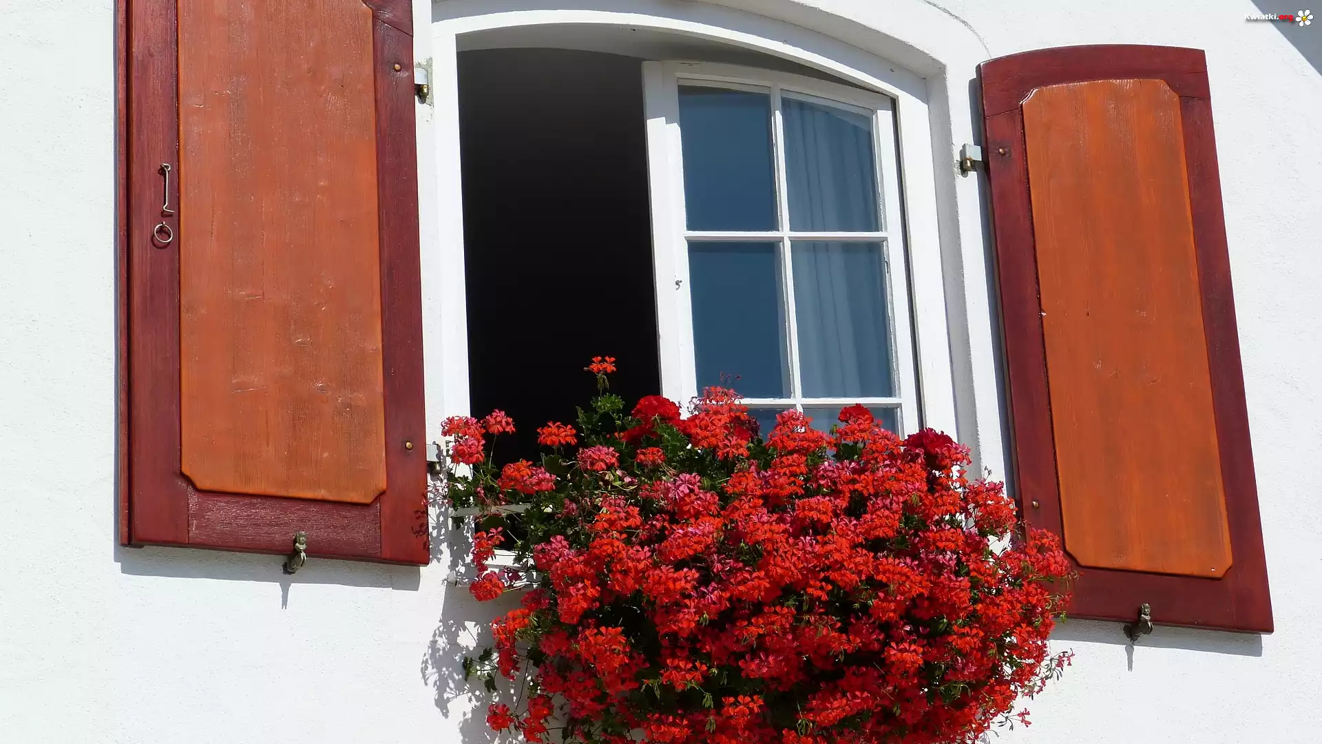 Okno, Kwiaty, Pelargonie, Drewniane, Okiennice - Zdjęcia