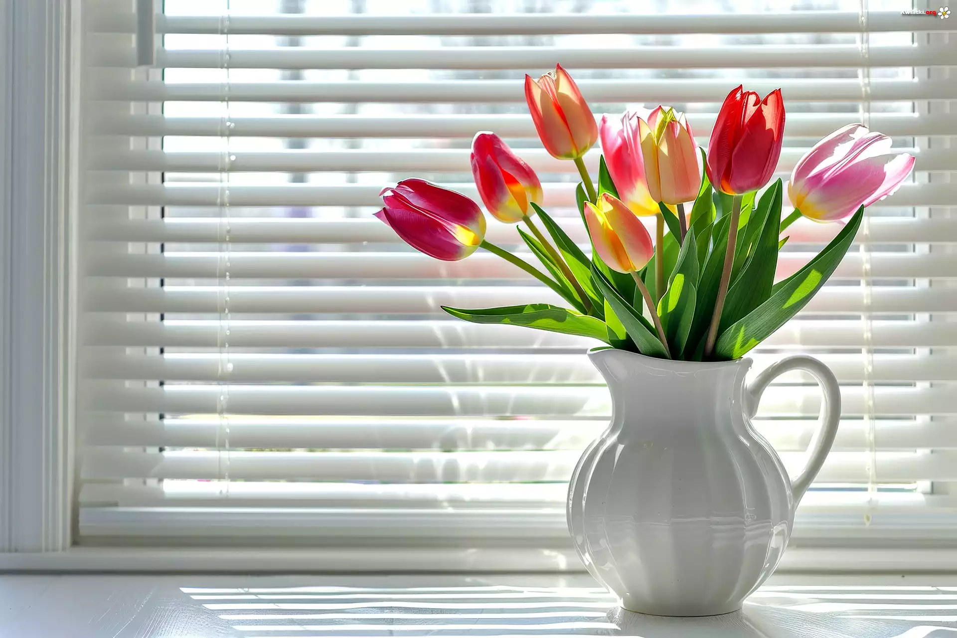 Tulipany, Bukiet, Dzbanek, Okno, Żaluzja, Grafika - Zdjęcia