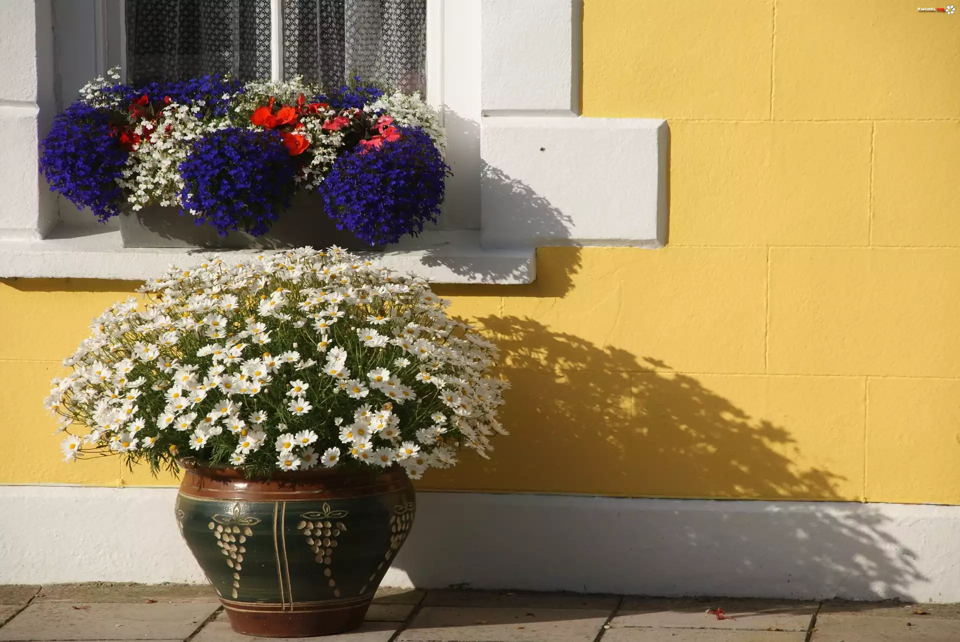 Okno, Donice, Lobelia, Rumianek - Zdjęcia