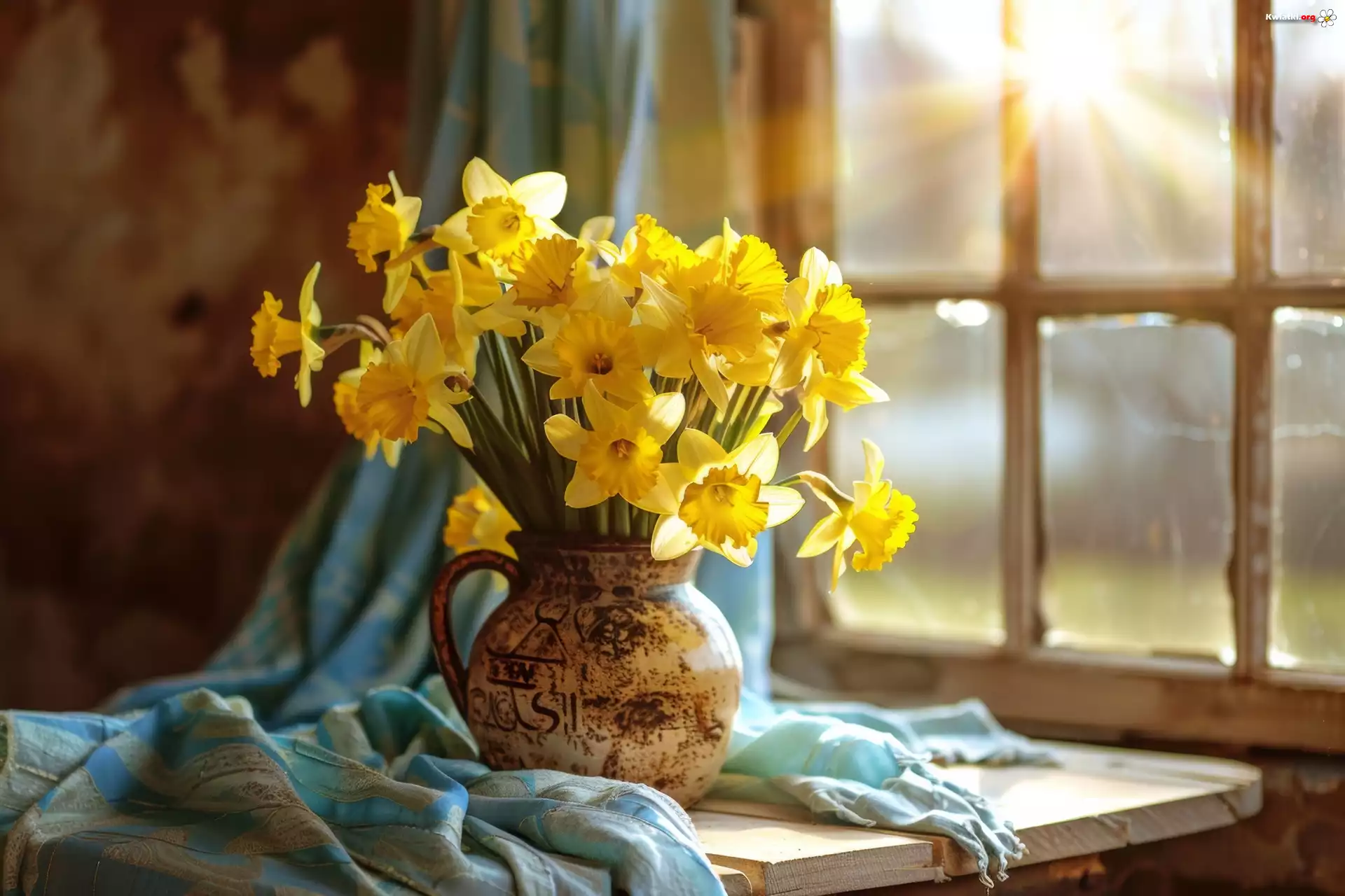Kwiaty, Narcyzy żonkile, Żółte, Bukiet, Dzbanek, Stół, Okno - Zdjęcia