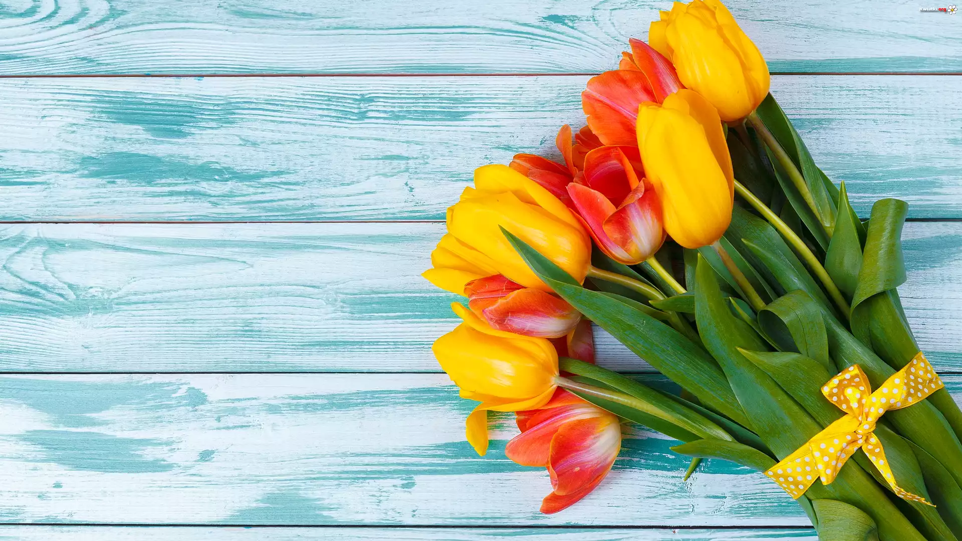 Kwiat Czerwone, Żółte, Tulipany, Bukiet, Wstążka, Niebieskie, Deski