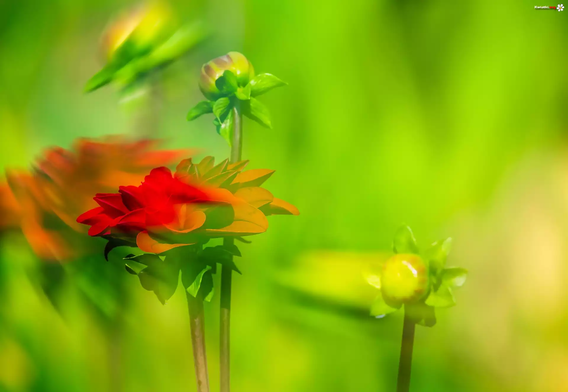 Kwiat Dalia, Pąki, Czerwone, Płatki, Liście, Rozmyte tło