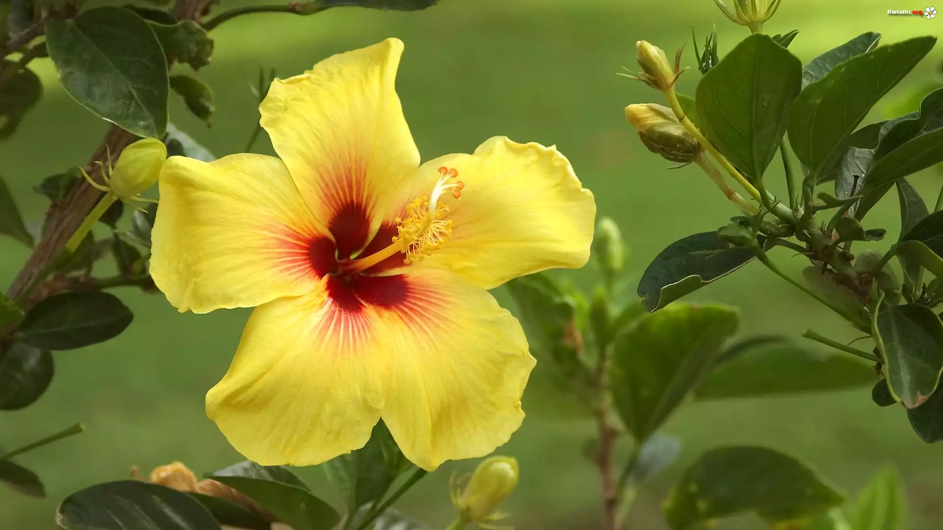 Kwiat Żółty, Hibiskus, Pąki, Liście