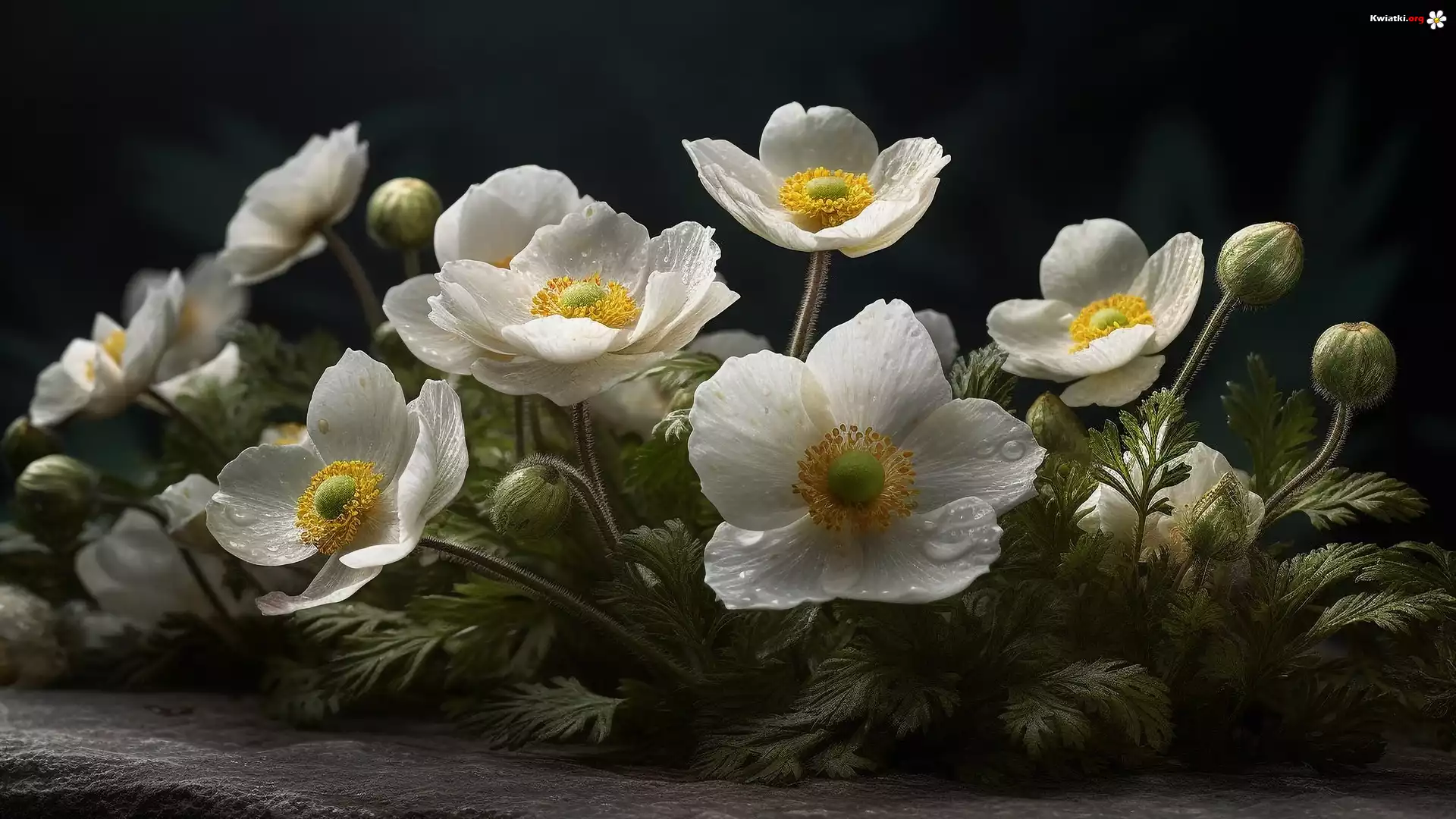 Kwiaty, Zawilce, Białe, Pąki, Ciemne tło - Zdjęcia