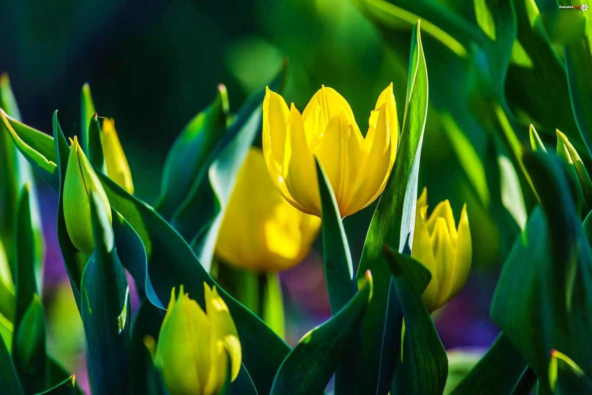 Żółte, Tulipany, Pąki, Liście - Zdjęcia