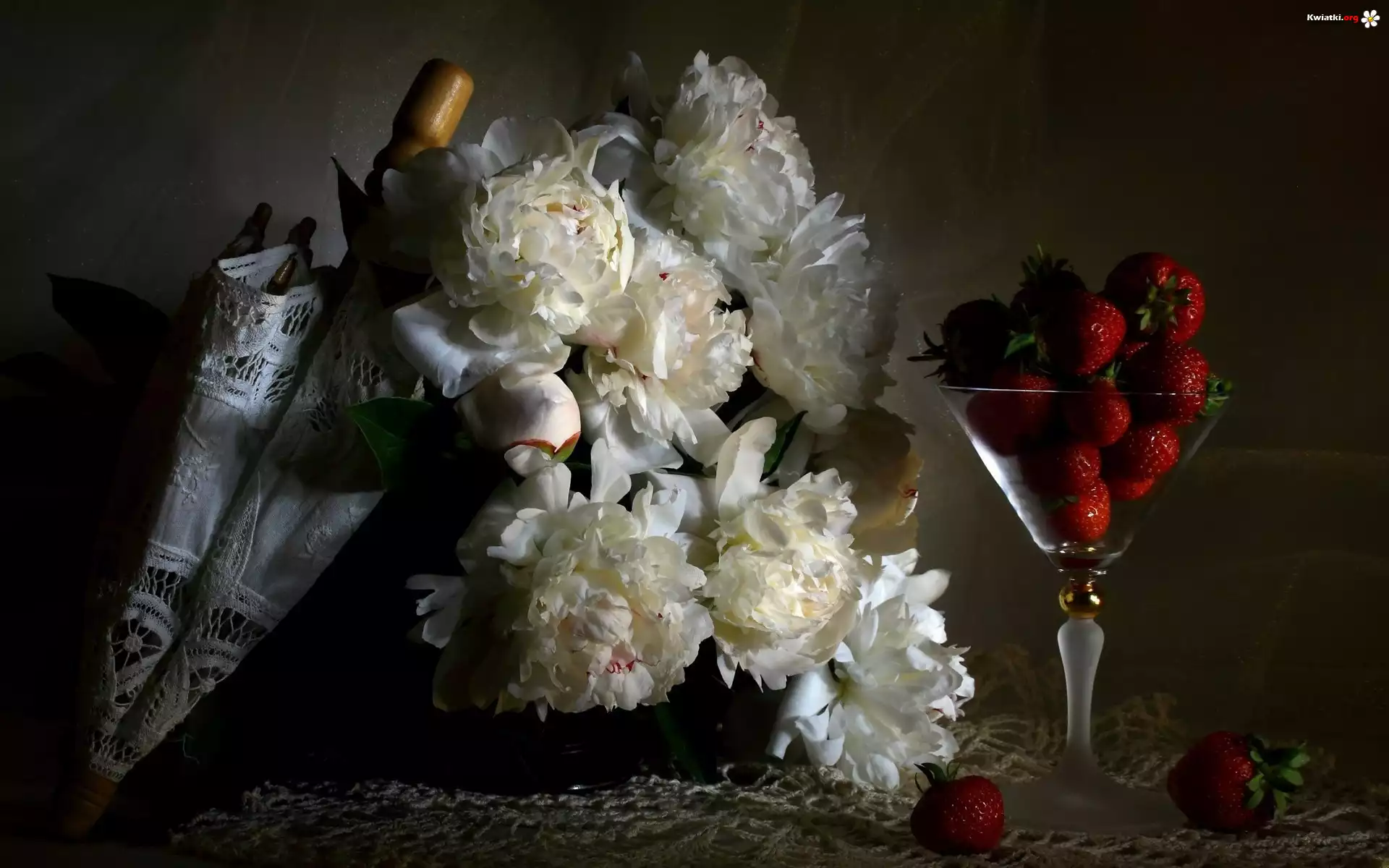 Kompozycja, Parasolka, Kielich, Truskawki, Bukiet, Piwonie - Zdjęcia